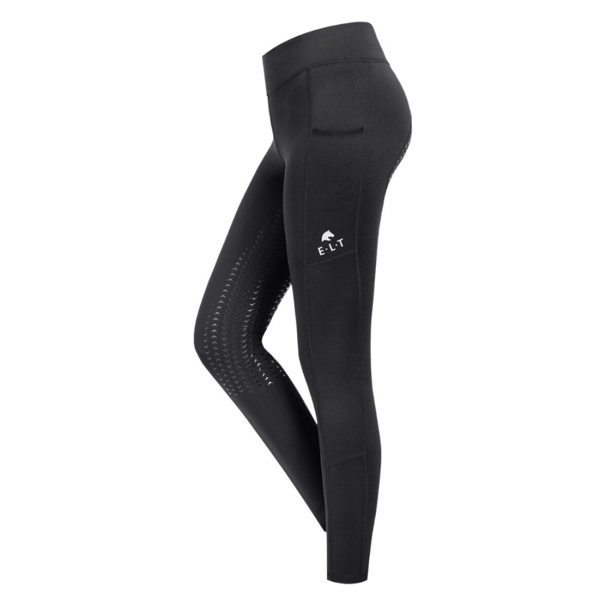 Ridetights til damer med bred linning og fuld silikone grip. Bukserne er med mobil lomme på venstre lår og ELT logo i gummi. De er lavet i elastisk materiale som er åndbart.