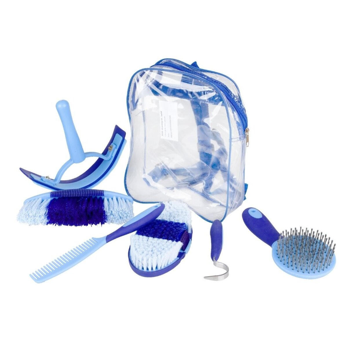Strigle taske med 6 kvalitets dele, bestående af hovrenser, blød kropsbørste, stiv kropsbørste, svedskraber, børste og mankam.