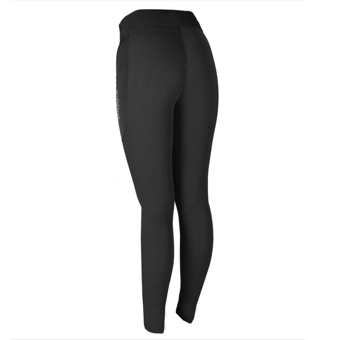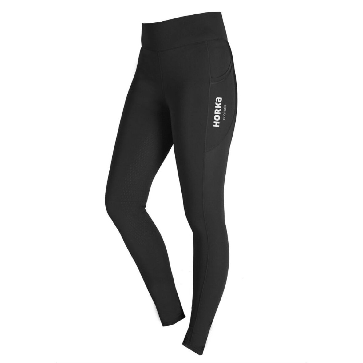 Ridetights fra Horka. Disse tights er fremstillet i komfortabelt materiale med en god stretch og fuld silikone grip, så man sidder optimalt i sadlen. De er med bred elastik linning som giver god støtte, telefon lomme på begge sider af låret og reflekterende Horka logoer.