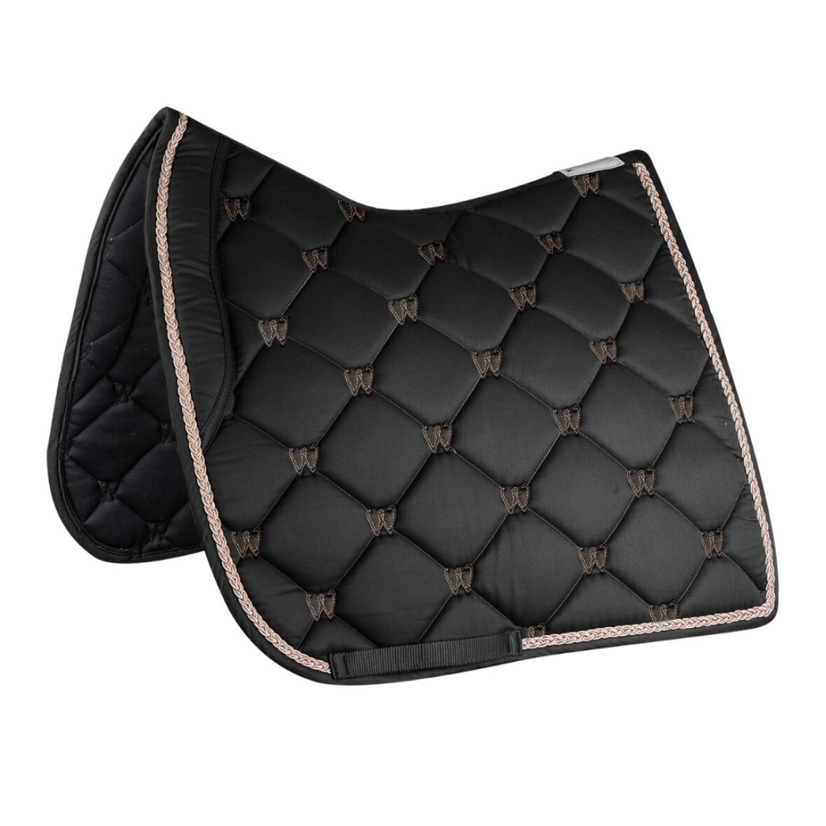 Elegant dressur underlag med silke glat look. Dressur underlaget er med bred kant foran for at give sadlen stabilitet og holde underlaget på plads. Bred flettet pipe rund i kanten og er fremstillet med optimal åndbarhed samt en god polstring som giver den rigtig trykfordeling på hestens ryg.