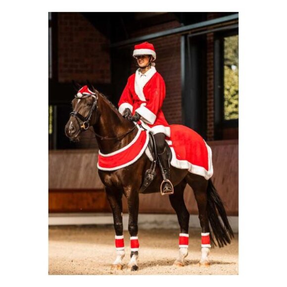 Jule sele til hest fra Horze. Denne jule sele sættes om hestens hals og giver den sidste julestemning. Den er med blød kunstig plys indvendig og fastgøres nemt med nylon stropper.