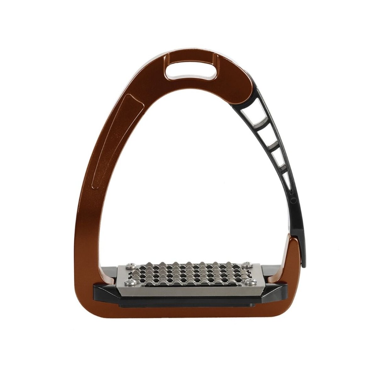 På grund af design og konstruktion, der er baseret på fleksible polymerer, formidler stigbøjlen en mindre stiv og meget mere behagelig følelse for rytteren end med konventionelle produkter Den fjedrende bøjle- og fodstøtteanordning er i stand til effektivt at absorbere og kompensere for kortsigtede og pludselige påvirkninger, der udøves gennem rytterens vægt. Betydelige fordele for rytteren: stærk lindring af fodbund, ankler, knæ og hofter Derfor også meget interessant for ryttere, der lider af ortopædiske problemer.