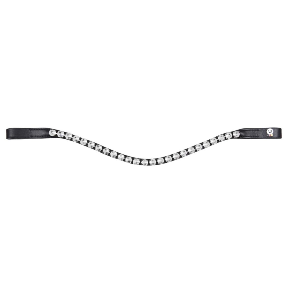 Læder pandebånd med krystaller i en klar hvid farve. Pandebåndet er buet og med Waldhausen logo på den ene side.