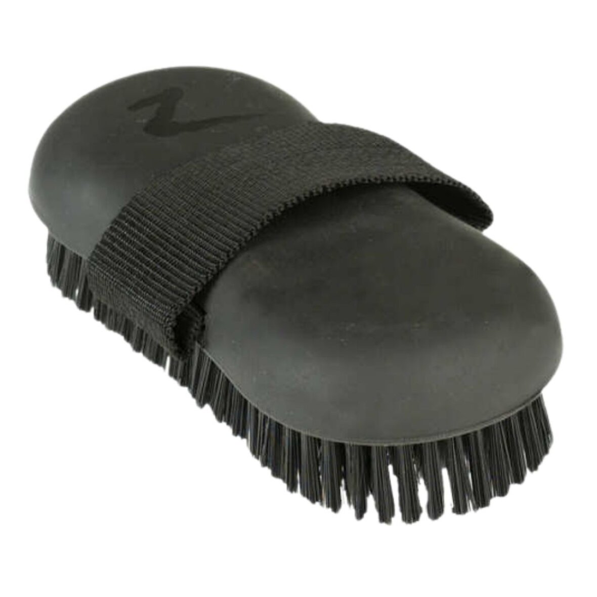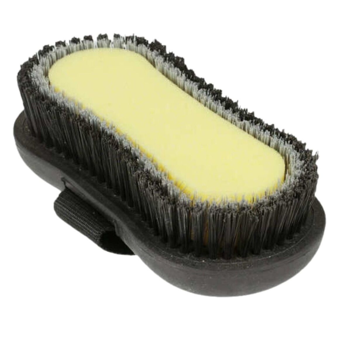 To-i-en badebørste fra Horze. Kombinationen af svamp og børste med to rækker bløde børster omkring en absorberende svampekerne. De ydre børster er lidt længere end svampen for at sikre en grundig rengøring. En blød, komfortabel gummiryg med en nylonrem gør at den er nem at holde om selvom den er dyppet i vand.