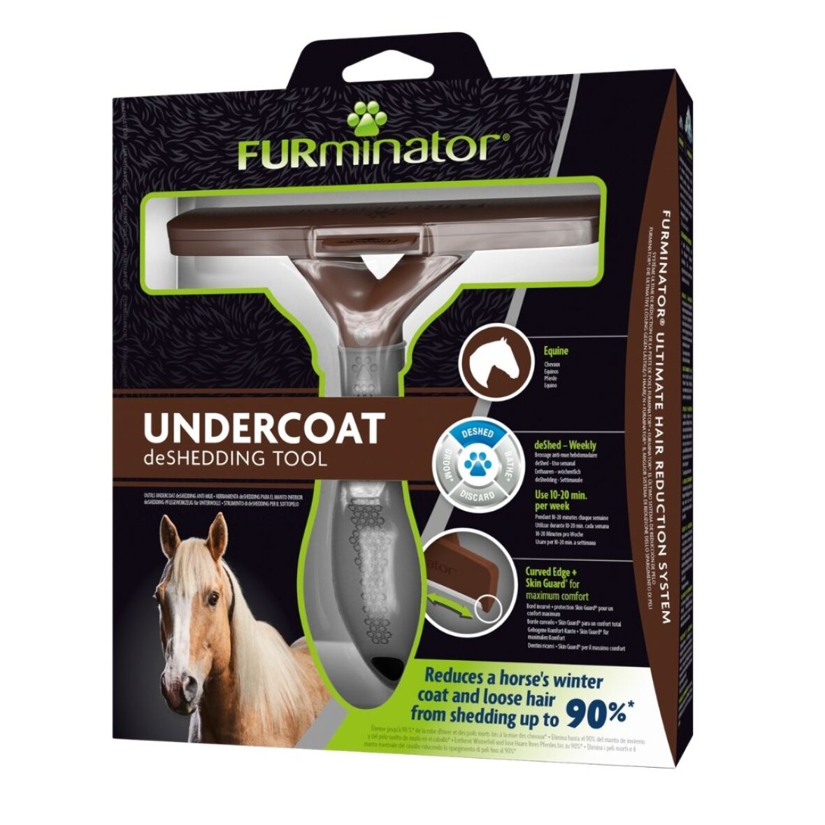 Fælder din hest, og har du hår over alt på dit tøj, og det kommer i øjne og mund. Med Furminator er der en nem måde at fjerne hestens "vinterfrakke" på, og få alle de løse hår væk hurtigere end enhver anden børste eller kam. Daglig pleje med dette værktøj hjælper med at opretholde sundere hud og pels. Designet af kanten gør det muligt for værktøjet at skubbe gennem pelsen for let og forsigtigt fjerne underlaget og løs hår. Uden at skære eller irritere hestens sarte hud, når den anvendes som anvist.