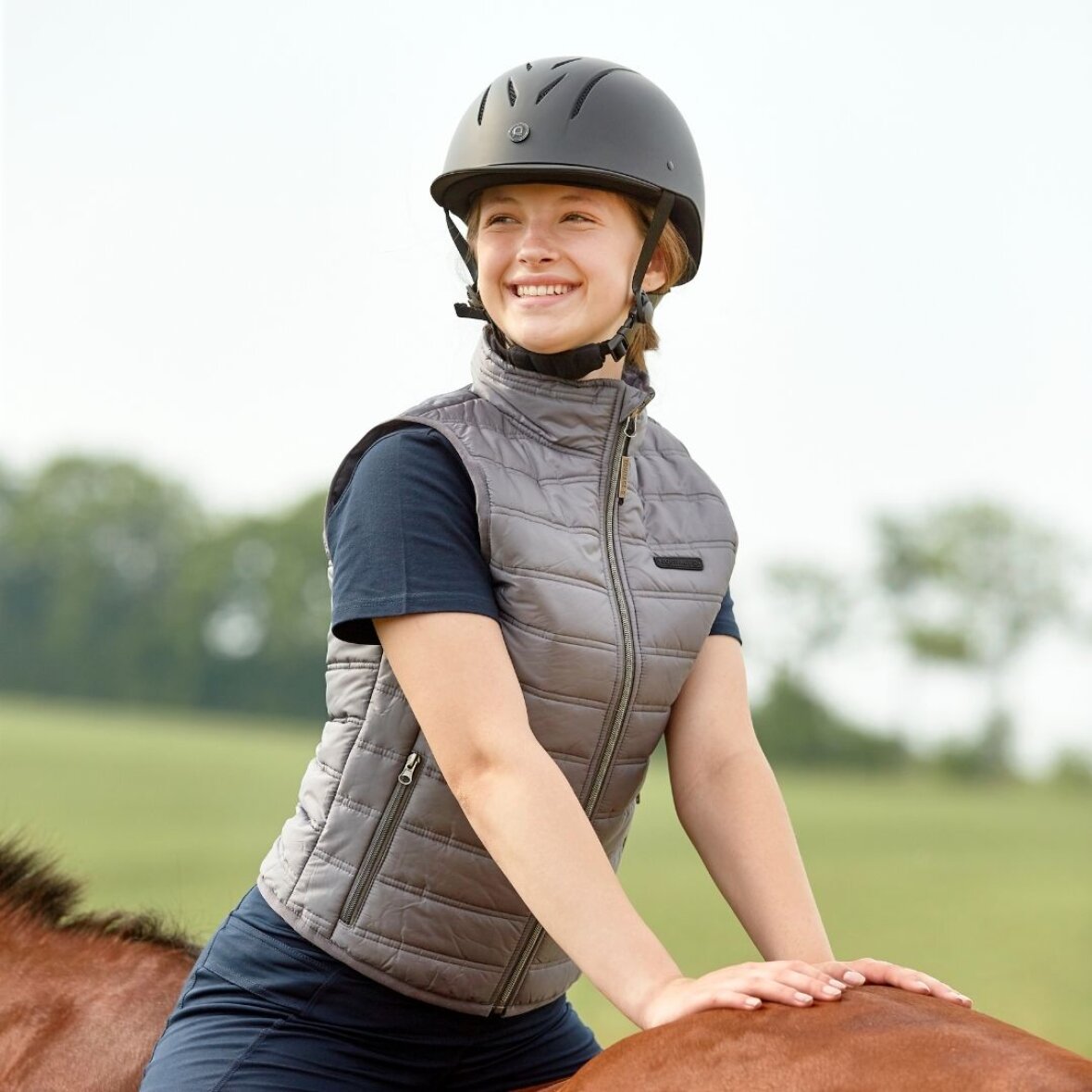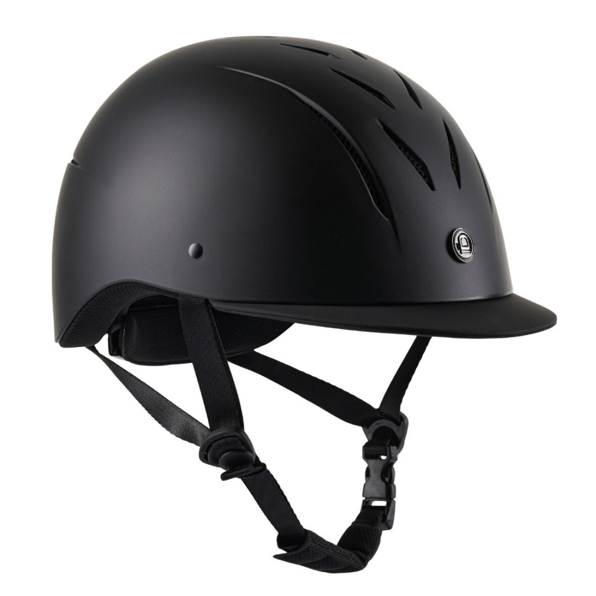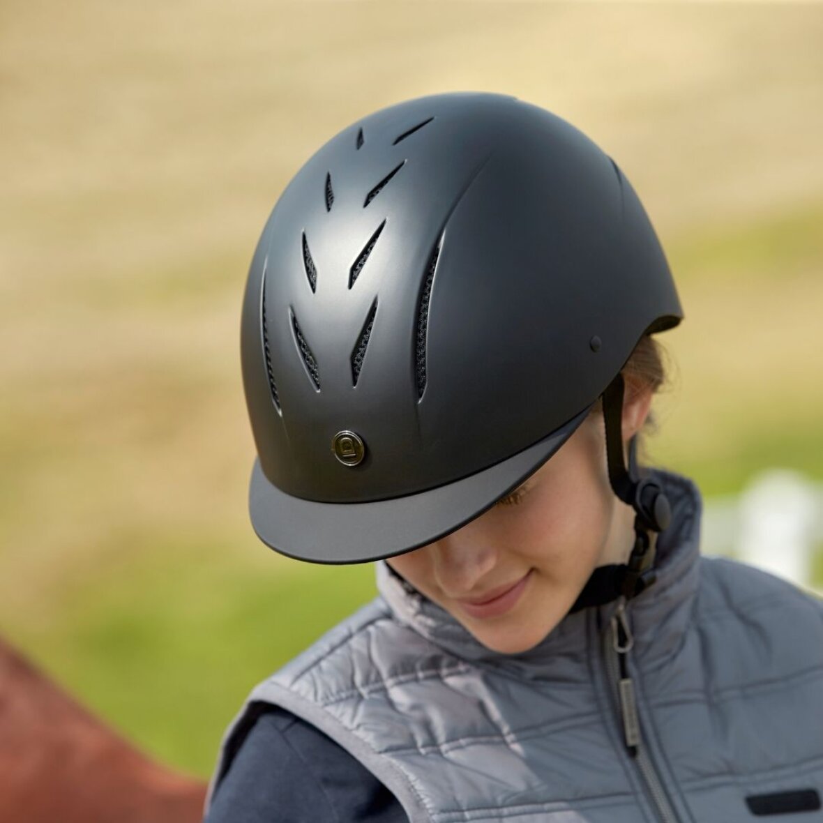 Mat sort ridehjelm fra Equipage. Ridehjelmen er med blød foring indvendig og kan justeres i størrelse på den runde knap i nakken. Den er med ventilations huller i toppen, så man ikke overopheder under ridning. Ridehjelmen justeres i hageremmen for at den sidder perfekt.