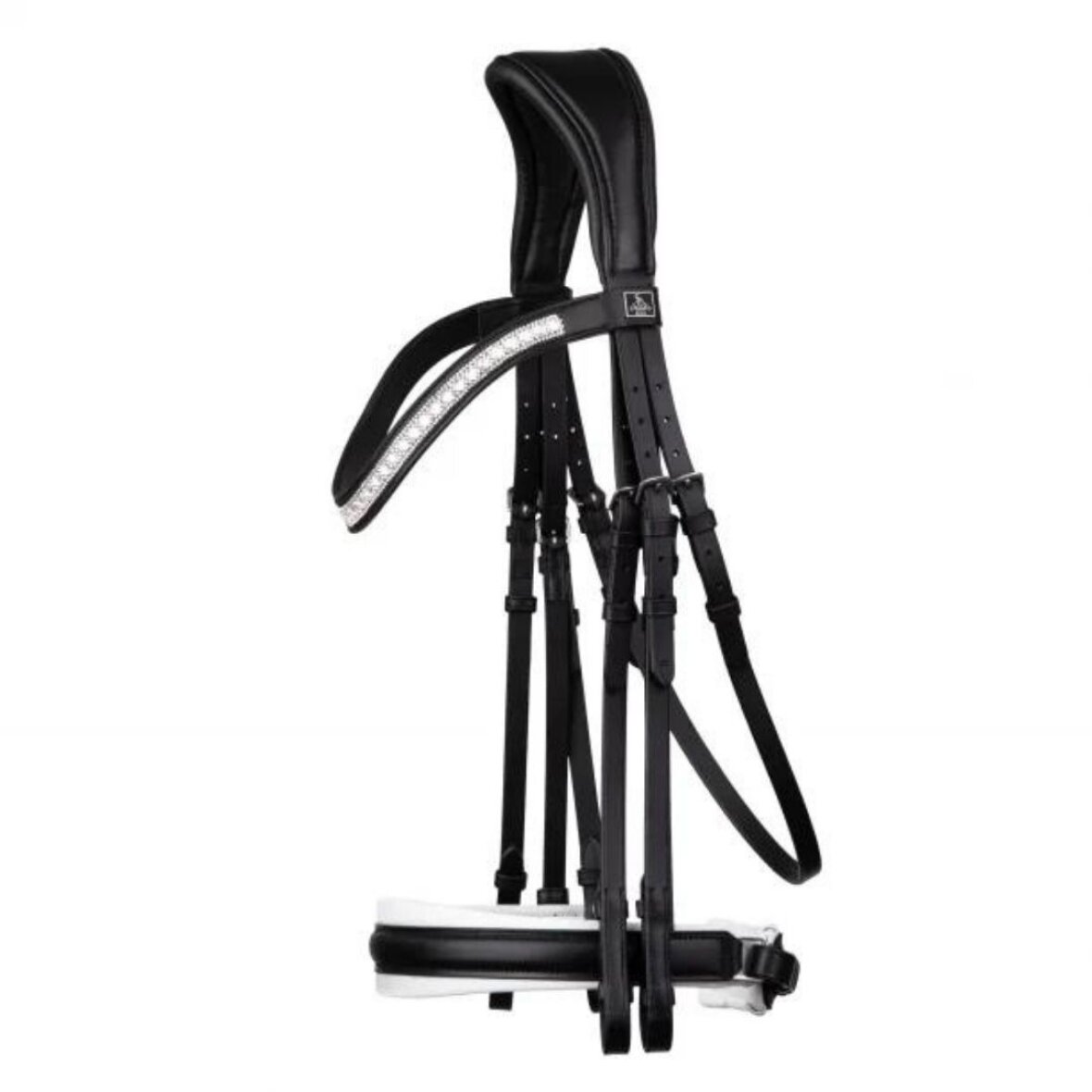 Kandaren er lavet med SD Designs mest populære nakkerem. Den har et dobbelt lag foring og er måske nok den blødeste nakkerem. Det dobbelte lag foring reducere trykket på nakken væsentligt. Nakkeremmen har desuden en større anlægsflade, som hjælper med at minimere og fordele trykket på nakken. Næsebåndet er SD Design signatur design, som er ekstra bred på midten og bliver smallere i begge sider, så den undgår de omkringliggende nerver og giver god plads til biddet. Foringen er på næsebåndet er hvid og super blød. Pandebåndet er så unikt med et mix af firkantede krystaller og små Crystal Chatons.