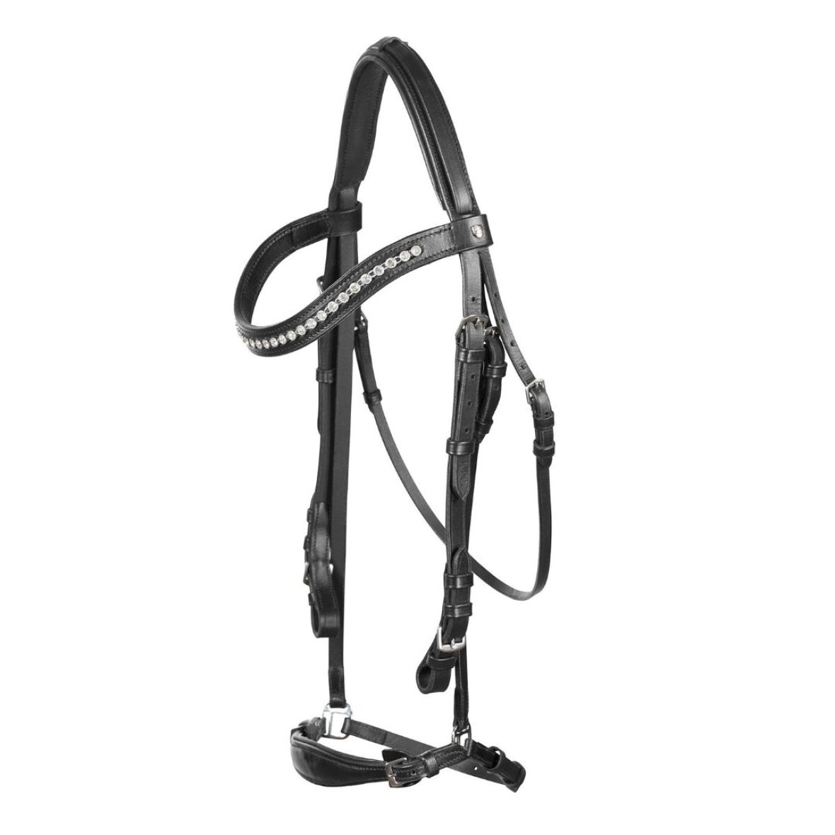 Læder trense fra Horze med hannoveransk næsebånd. Trensen er med let buet pandebånd og krystaller samt med foring i nakke og næsebånd. Trensen er med rustfrie metalspænder.