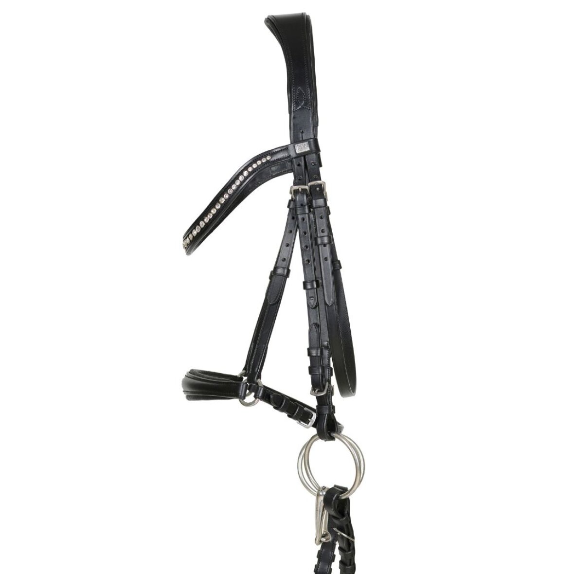 Læder trense fra HorseGuard med hannoveransk næsebånd. Trensen er med anatomisk nakkerem og blød foring. Pandebånd med hvide krystaller. Det hannoveranske næsebånd er med blød foring indvendig. Trensen spændes med metal spænder. Der medfølger supergrip tøjler med stoppere til denne trense.