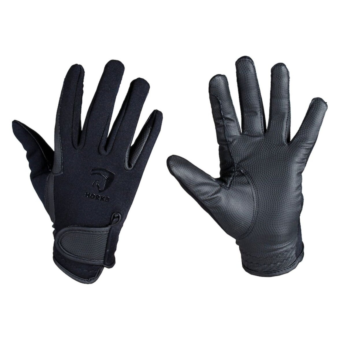 Komfortable ridehandsker med varm fleece på ryggen, hvilket gør dine hænder mindre tilbøjelige til at blive kolde. Håndfladen er lavet af PU-læder, dette materiale er elastisk, slides ikke hurtigt og giver godt greb om tøjlerne. Ridehandskerne lukkes med velcro ved håndryggen.