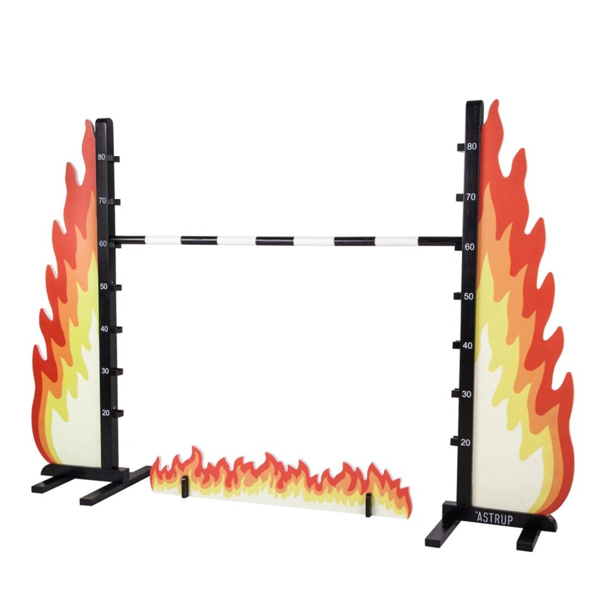 Ild spring fra By Astrup. Dette fine spring bruges til kæpheste ridning og er med støttere i flammer og med en flamme liggende på jorden. Du kan indstille springet i forskellige højder, ændre sværhedsgraden efter alder og færdigheder. Med 10 cm mellemrum kan bommen placeres i højder fra 20 cm til 80 cm. By Astrup har minimeret risikoen for fald og skader ved at lave en stang, der let falder, hvis et barn rammer på.
