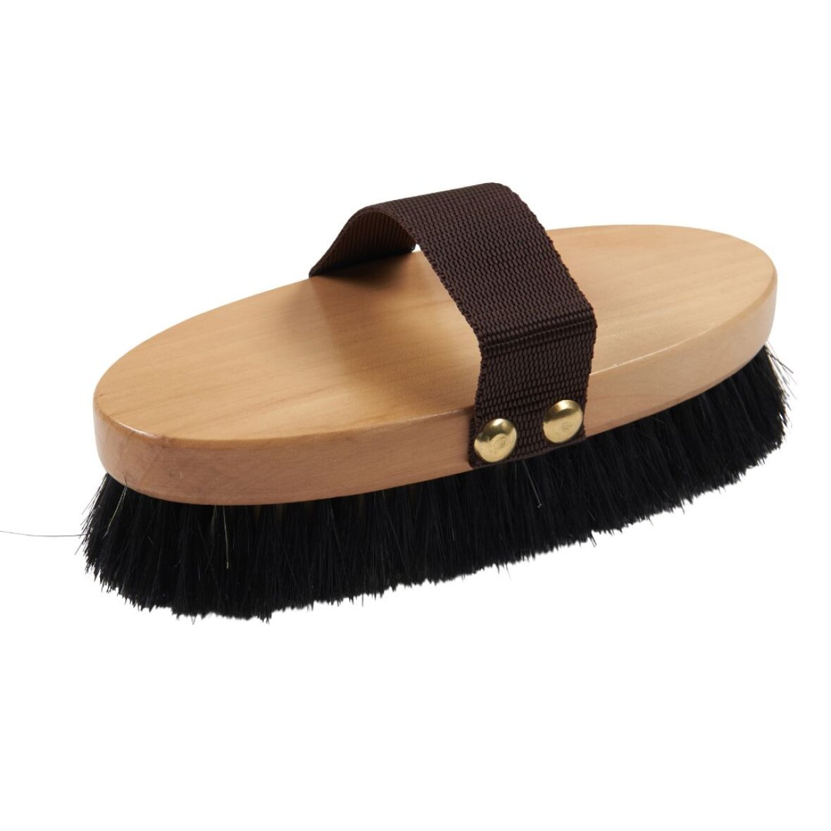 Kropsbørste i træ med grisehår fra HorseGuard. Med bred nylonstrop til hånden. Ternet mønster med lyse og mørke hår. HorseGuard logo på bagsiden.