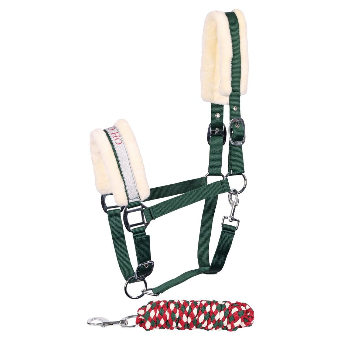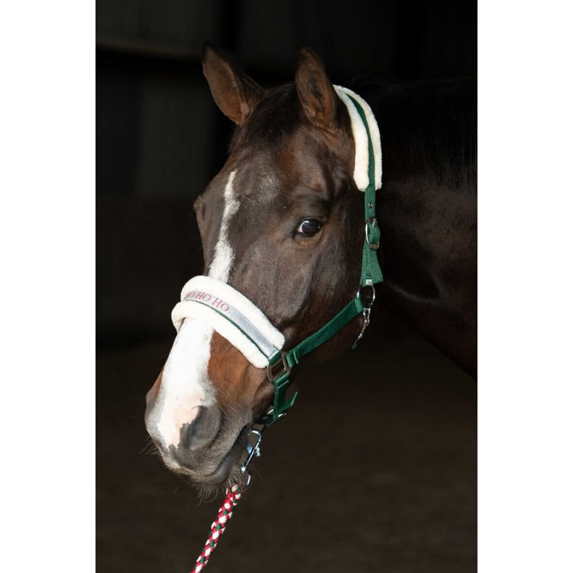 Jule grime med imiteret pels fra Harryshorse. Grimen kan justeres i størrelse 2 steder og er med sølv glimmer og tekst på næseremmen. Der medfølger et jule træktov som er flettet i rød, hvid og grøn.