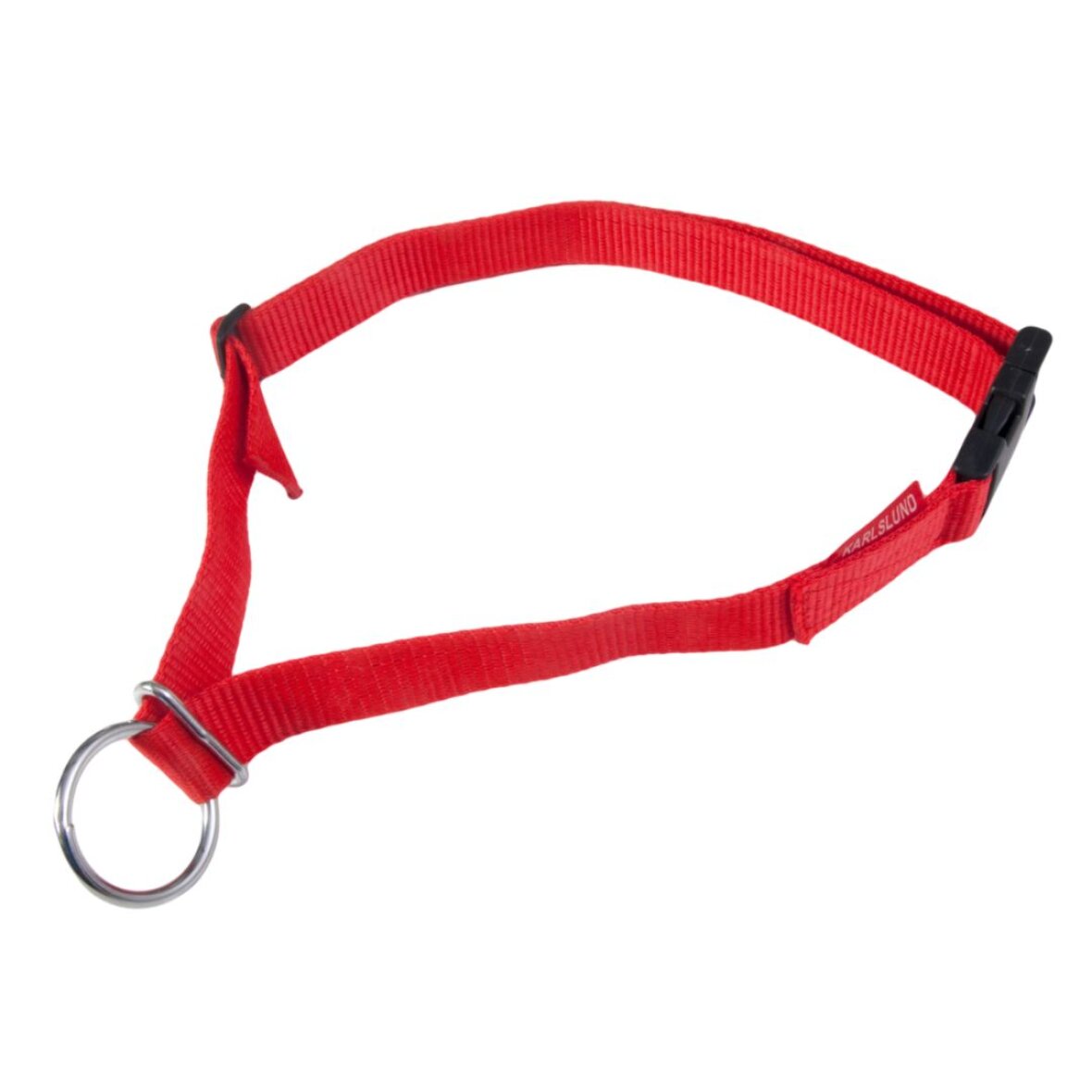 Simpel halsrem i nylon, med sikkerhedsspænde i plastik. Karlslund logo. God til f.eks. fodring og lignende.