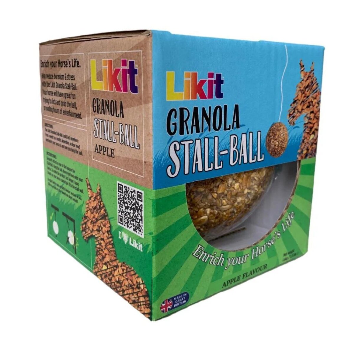 Smagfuld müsli kugle fra Likit. Denne bold er med smag af æble og kan hænges op eller ligges i krybben. Bolden er god aktivitet for heste i boks. Snor til ophæng medfølger ikke.