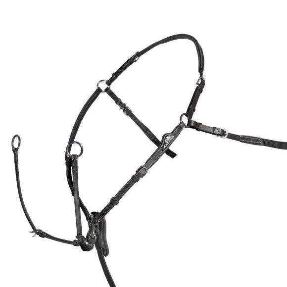 Kvalitets fortøj fra Equiline. Dette fortøj er med martingal og fremstillet i kvalitets læder fra Italien. Equiline logo patch på den ene side. Fortøjet er sort med justerbare metalspænder.