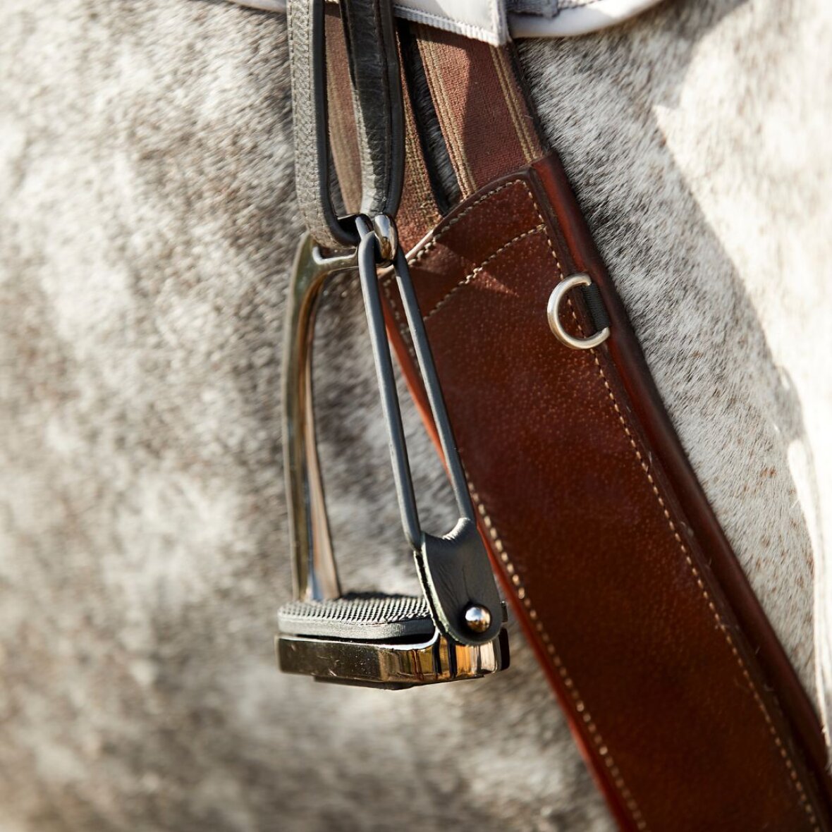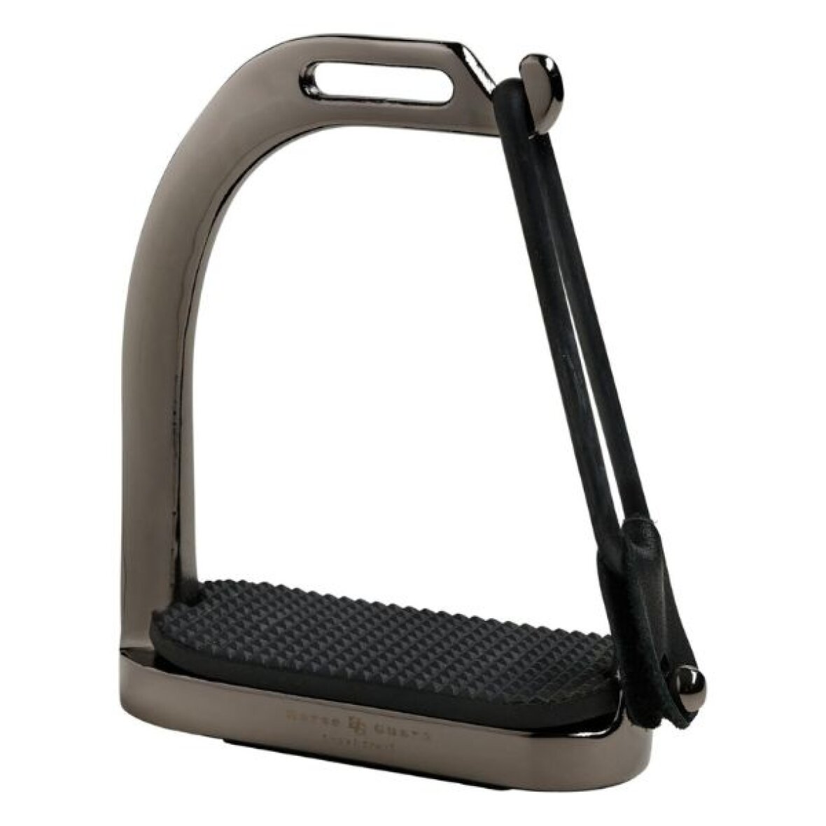 Sikkerhedsstigbøjler i rustfrit stål med sort gummiring og gummiindlæg, som gør at foden ikke sidder fast ved et styrt. Gummiringen går op og foden kommer fri i tilfælde af fald fra hesten.