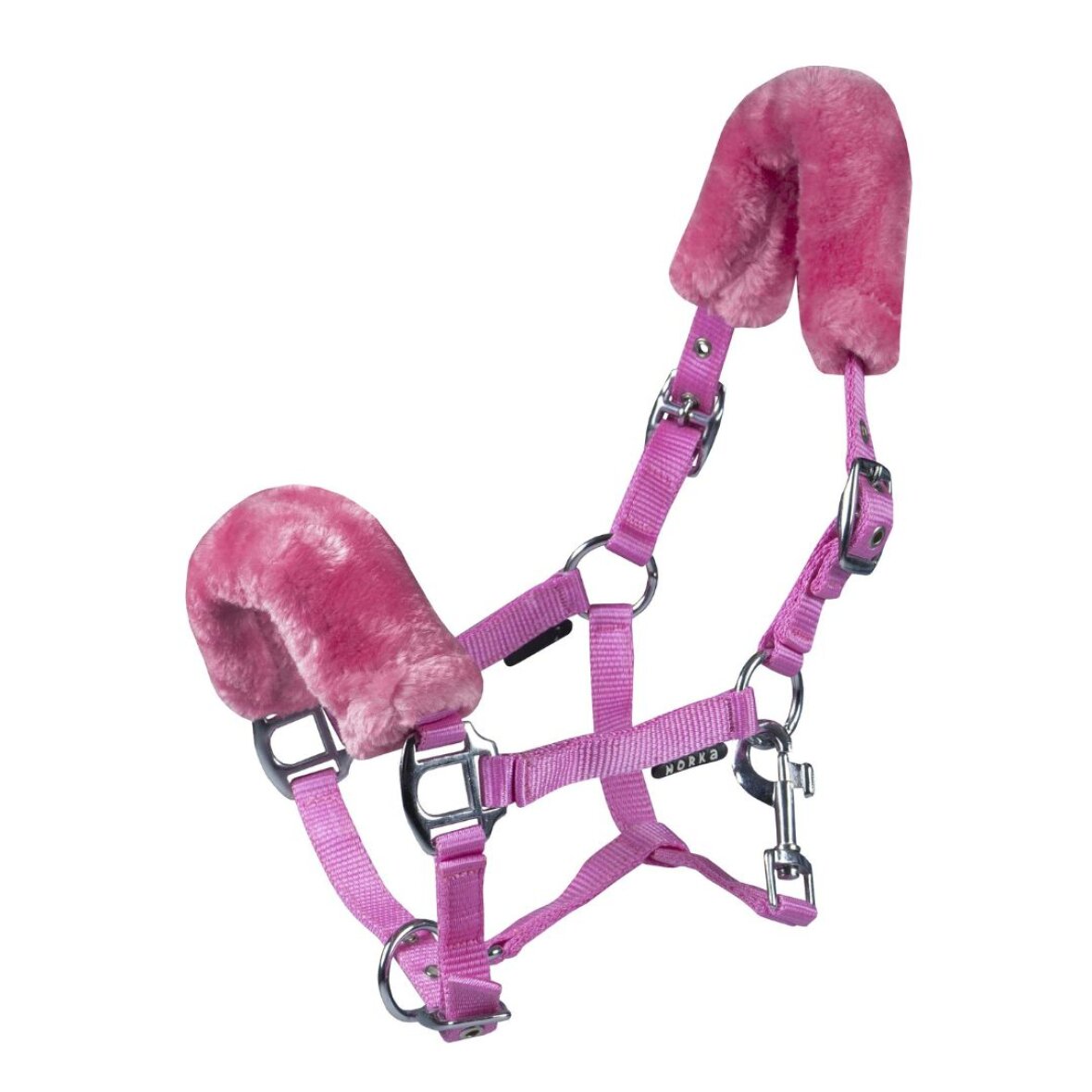 Følgrime i nylon med imiteret farvet plys. Grimen kan justeres i størrelse 3 steder og er med plys på nakke- og næserem. Grimen er med metal spænder.