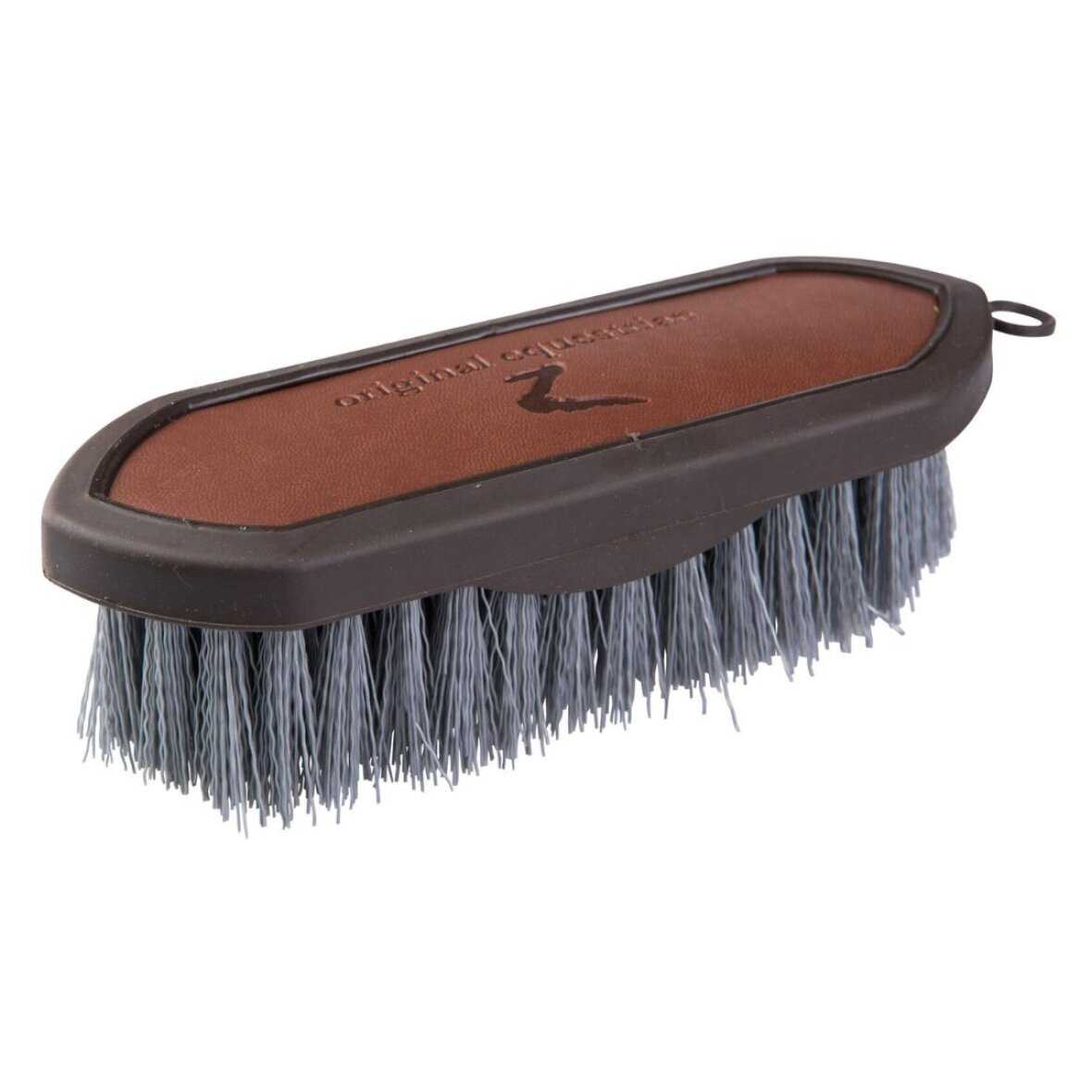 Horze strigle med syntetiske børster, læderlook og logo på ryggen af børsten.