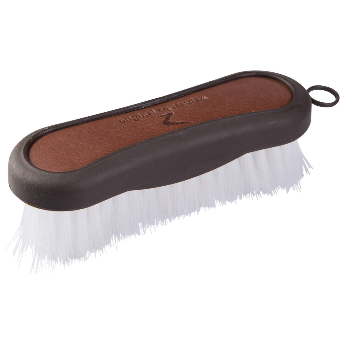 Hovedstrigle fra Horze med bløde børster og læderlook håndtag med logo.