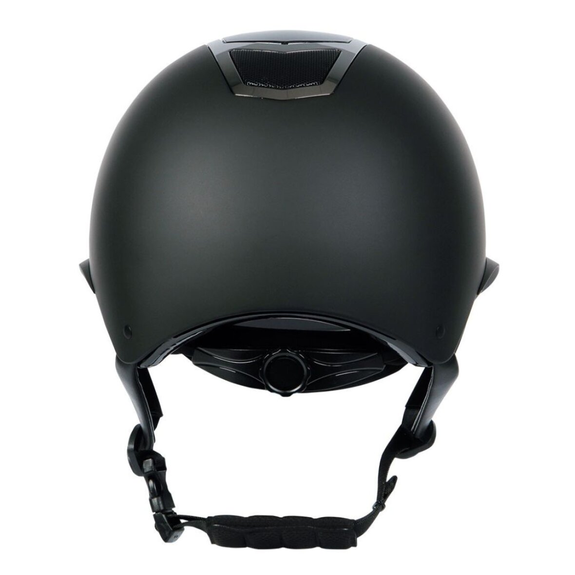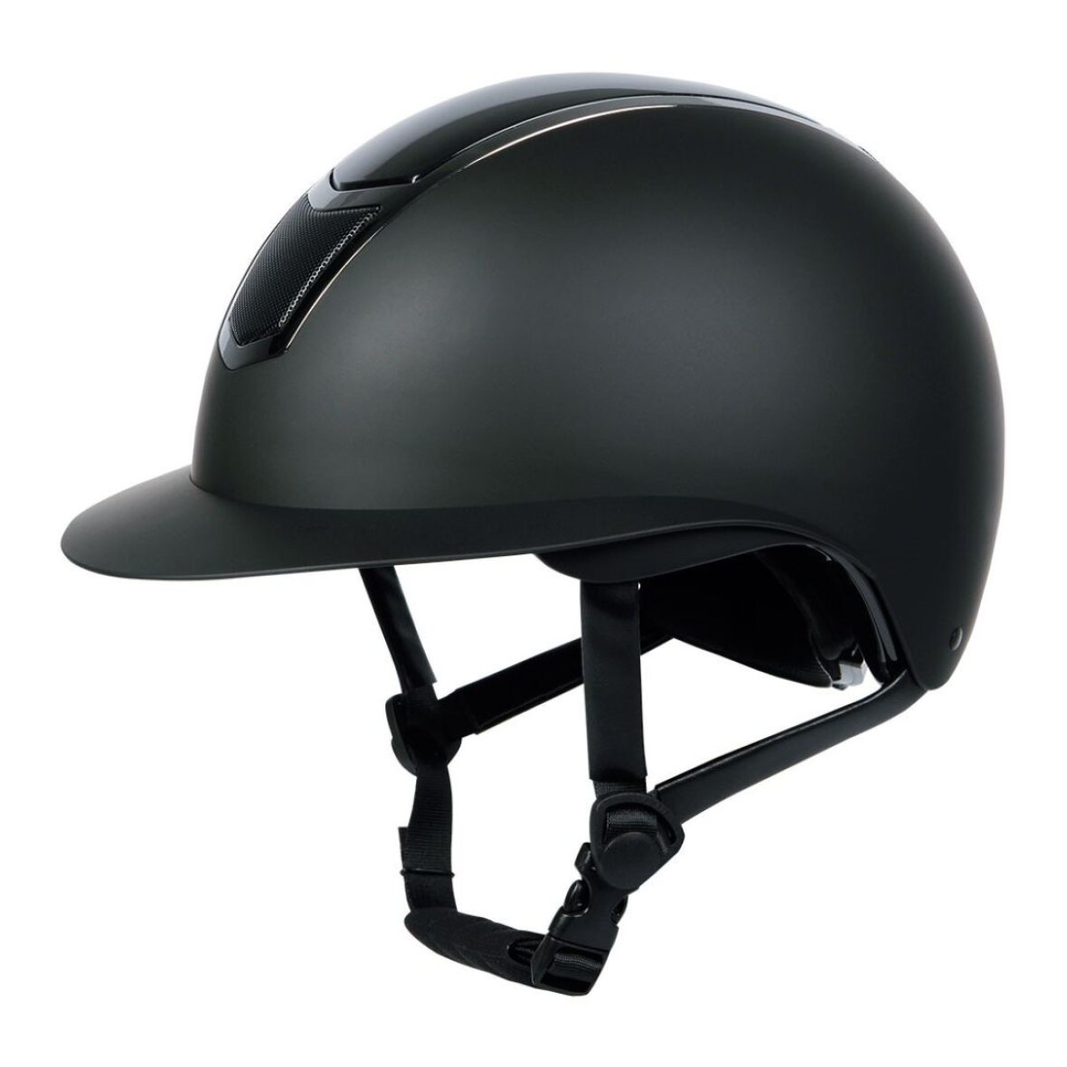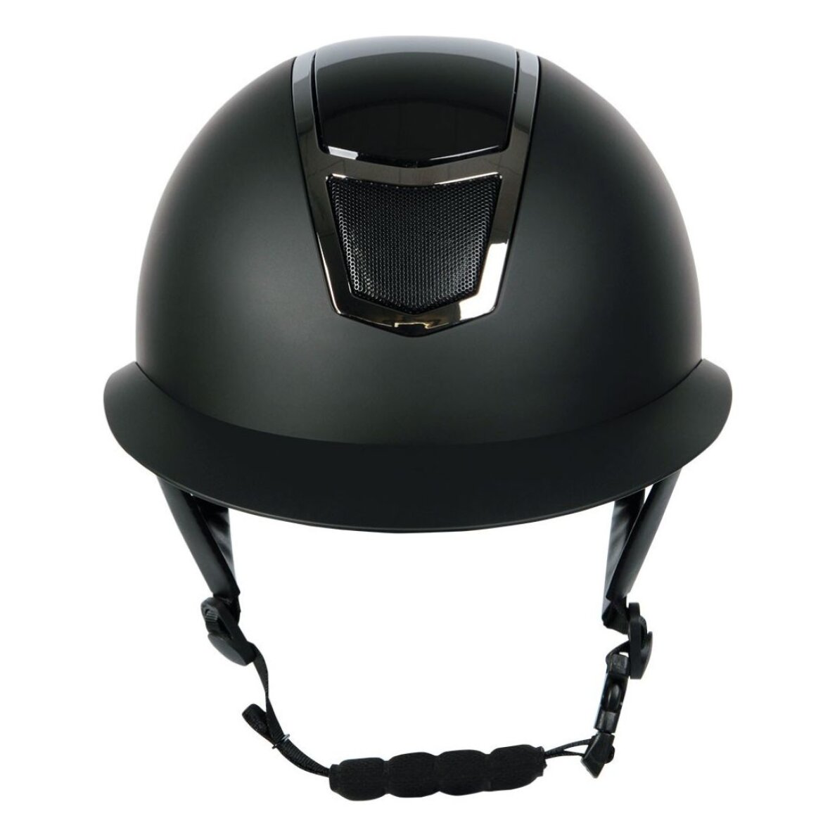 Flot ridehjelm med en sort skal i mat finish og med den moderne brede skærm. Ridehjelmens top er glossy og med sort metal ved ventilationshullerne. Indlæg er aftagelig og vaskbar. Hjelmen justeres i størrelse på drejeknappen i nakken. Ridehjelmen kan også justeres i størrelse i remmene under hagen.