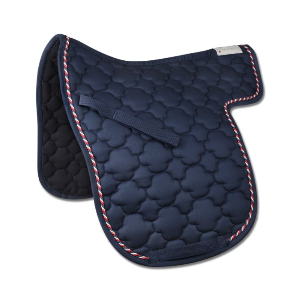 Anatomisk formet islænder underlag fra Waldhausen med blomsterquiltning og dekorativ pipes. Undersiden er i svedabsorberende og åndbart materiale. 300 g/m² polstring og 8 mm skum sikrer enestående trykfordeling og stødabsorbering til hestens ryg. Nylonstropper med velcro til fastgørelse.