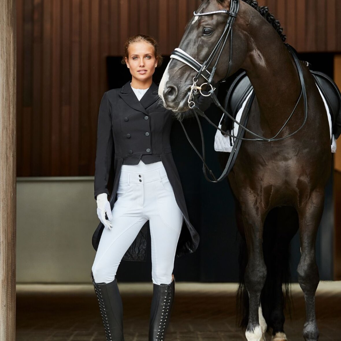 Stævneridebukser fra Catago. Ridebukserne er med fuld silkone grip, høj talje med bæltestropper. De er fremstillet i stretch materiale som samtidig er åndbart.