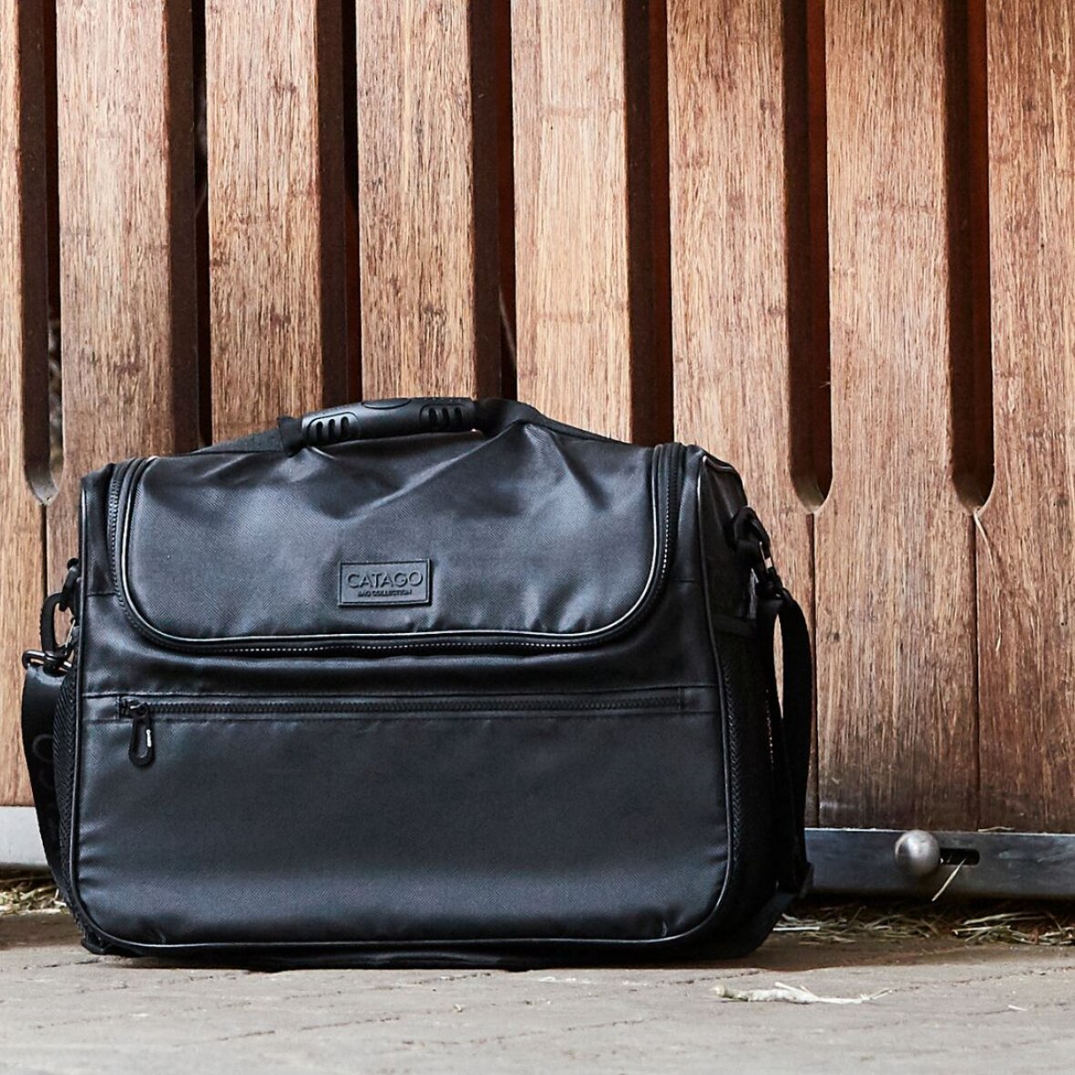 Slidstærk strigletaske fra Catago. Strigletasken er med flere rum til opdeling af børster og plejeprodukter. Den er med aftagelig skulderstrop og er udvendig med lynlås lomme i fronten. To netlommer i siderne til diverse. Robust nylon håndtag med plast. Catago gummi logo patch på fronten.