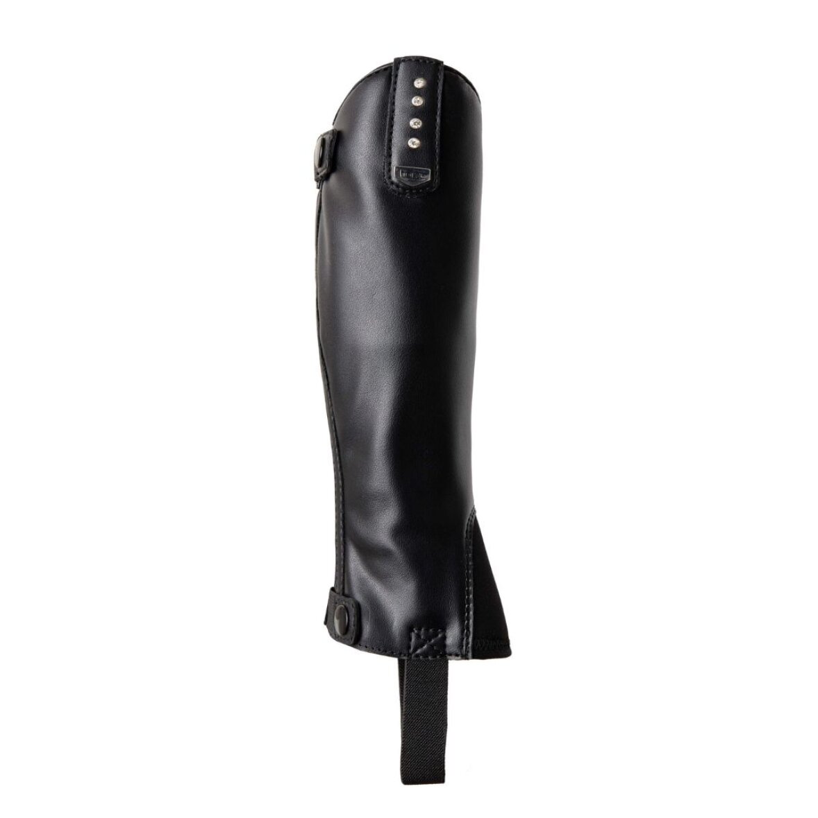 Børne leggings fra Horze med krystaller på toppens strop. Denne leggings er fremstillet i kunstlæder og er derfor virkelig nem at holde, den er med lynlås bagtil og neopren materiale som går over støvlerne.