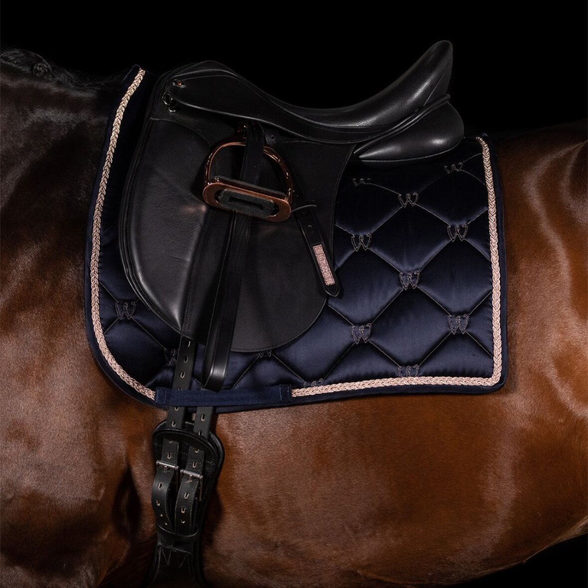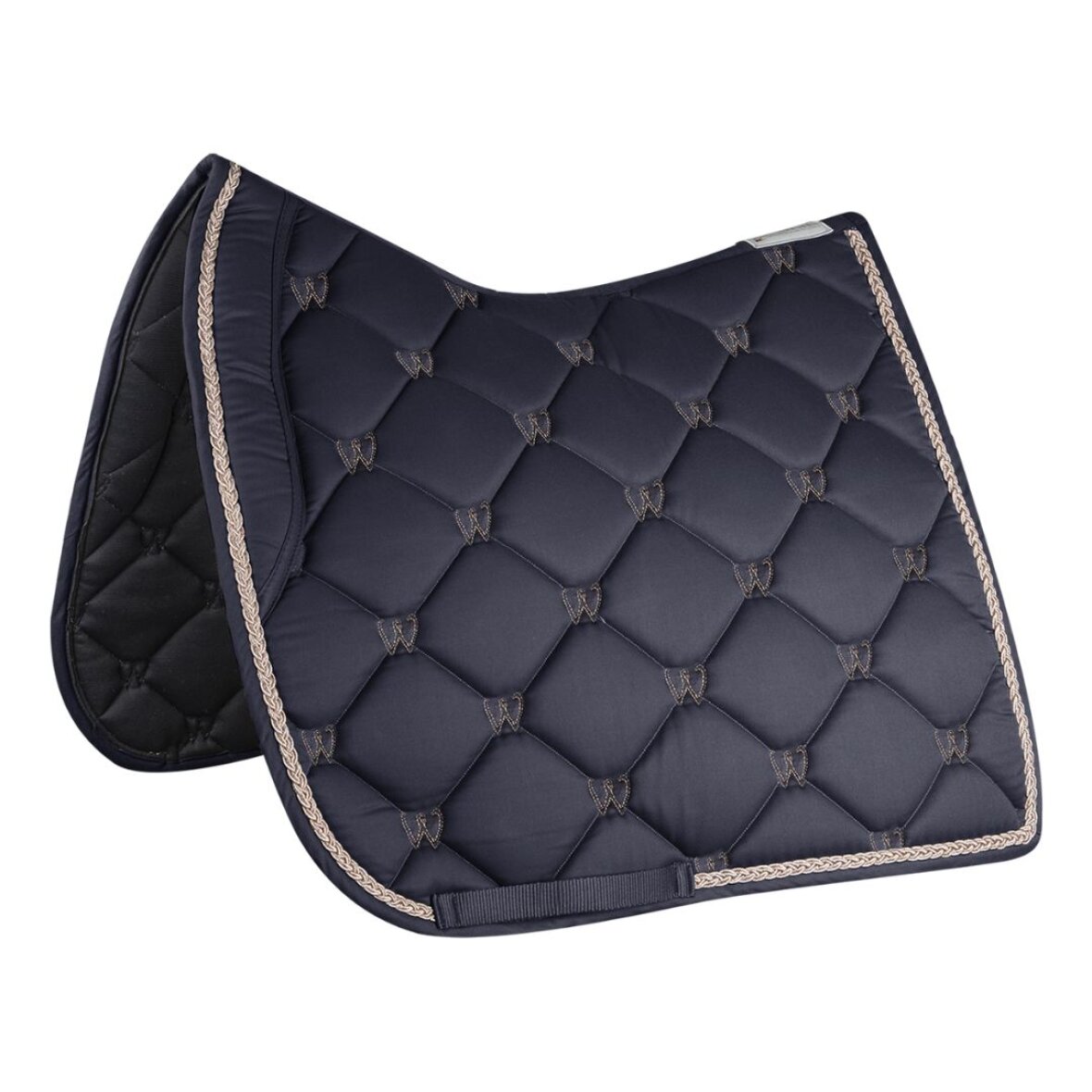 Elegant dressur underlag med silke glat look. Dressur underlaget er med bred kant foran for at give sadlen stabilitet og holde underlaget på plads. Bred flettet pipe rund i kanten og er fremstillet med optimal åndbarhed samt en god polstring som giver den rigtig trykfordeling på hestens ryg.