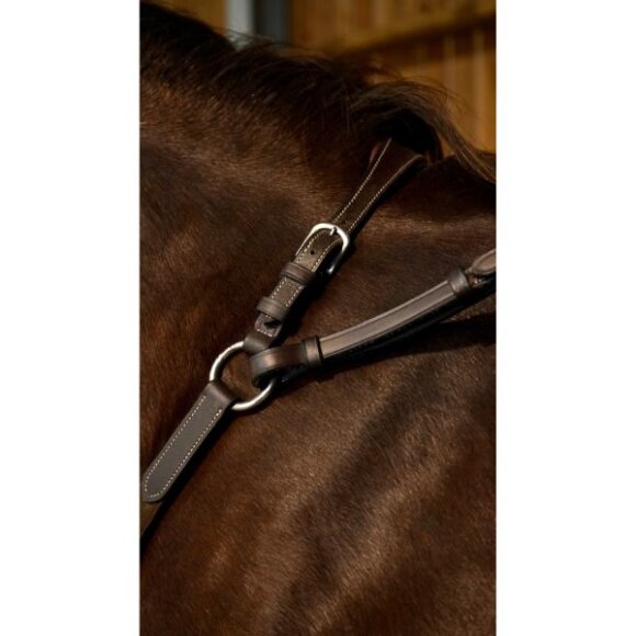 Fortøj med hvide syninger fra Dyon's working collection. Fortøjer er med justerbar bro og 6 cm lange elastik bånd der giver hesten mere komfort.