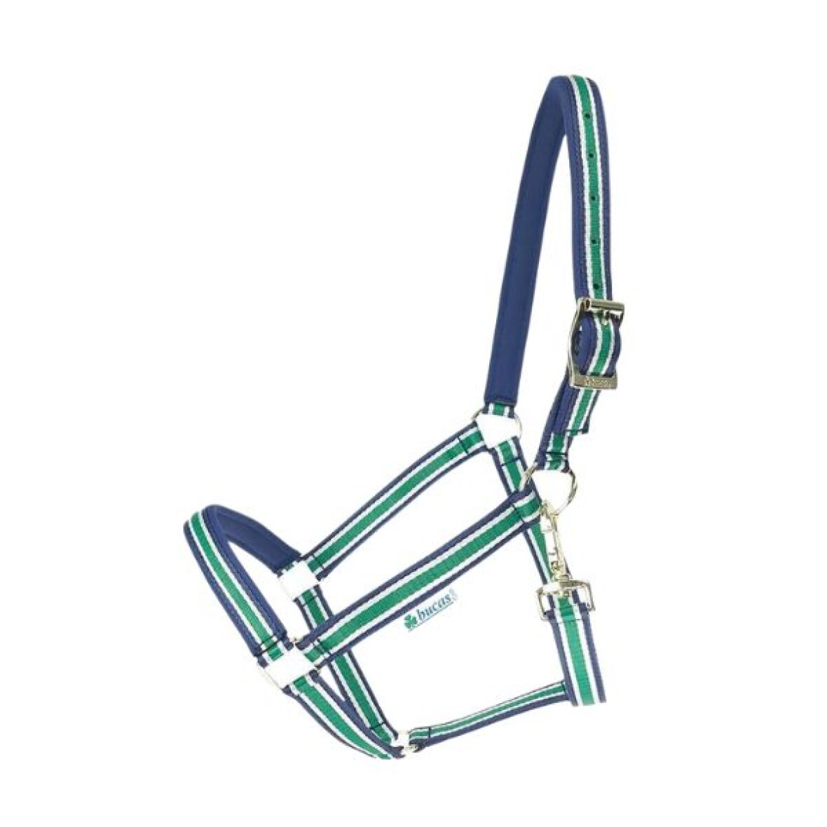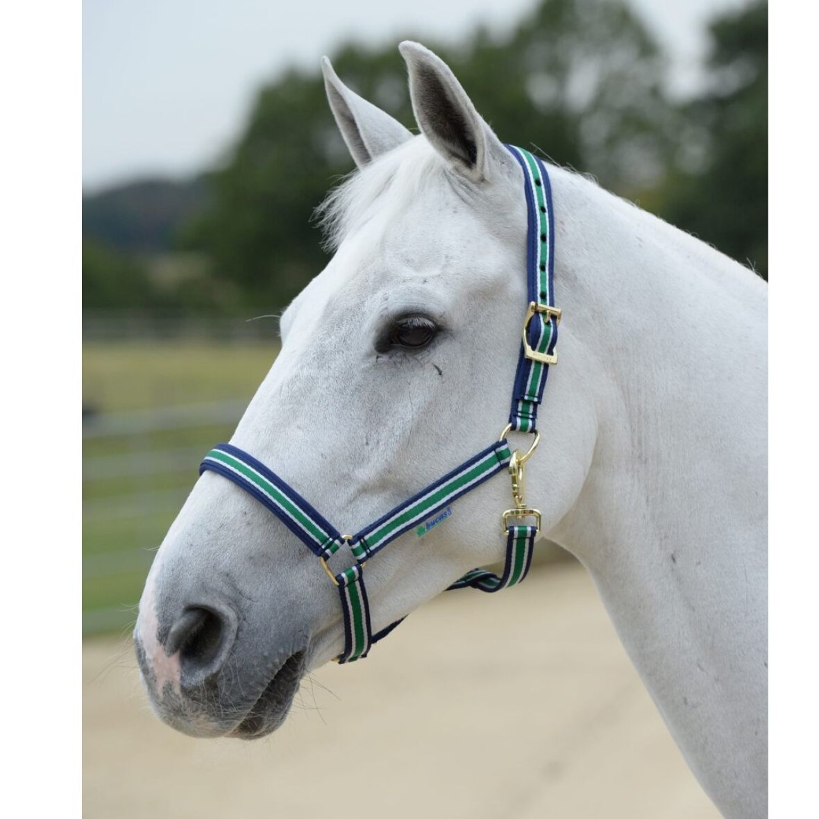 Silke blød grime fra Bucas med foring i næse og nakkeremmen. Grimen er stribet og med guldfarvet spænder. Ringen hvori kæberemmen bliver spændt er dejet da det gør det nemmere ar spænde grimen samt forhindre karabinhagen at gnide på hesten. Grimen justeres i størrelse i nakkeremmen.