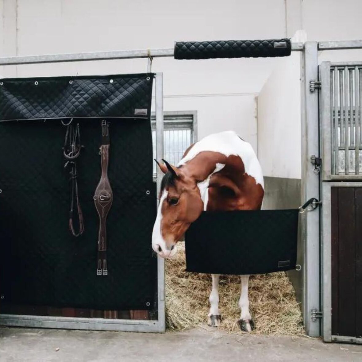 Dette Kentucky boks forhæng lader din hest kunne stikke hovedet ud af boksen. Forhænget har guld ringe i de øverste hjørner med nylonstropper, som bruges til at fastgøre gardinet til boksen. Derudover er der to ringe i bunden af forhænget også, hvis man ønsker, det skal fastgøres yderligere.