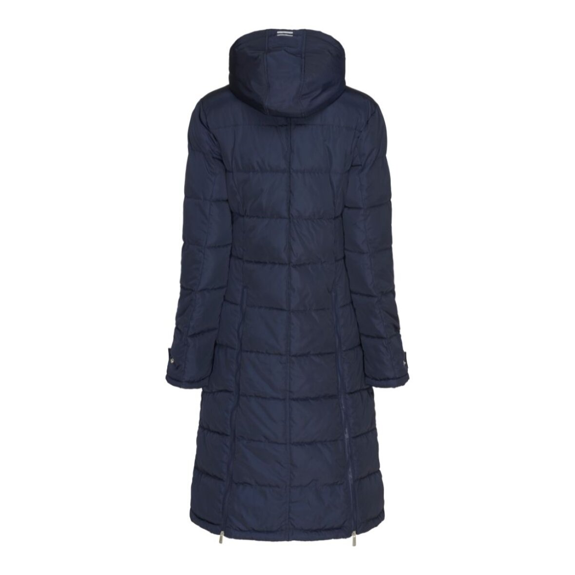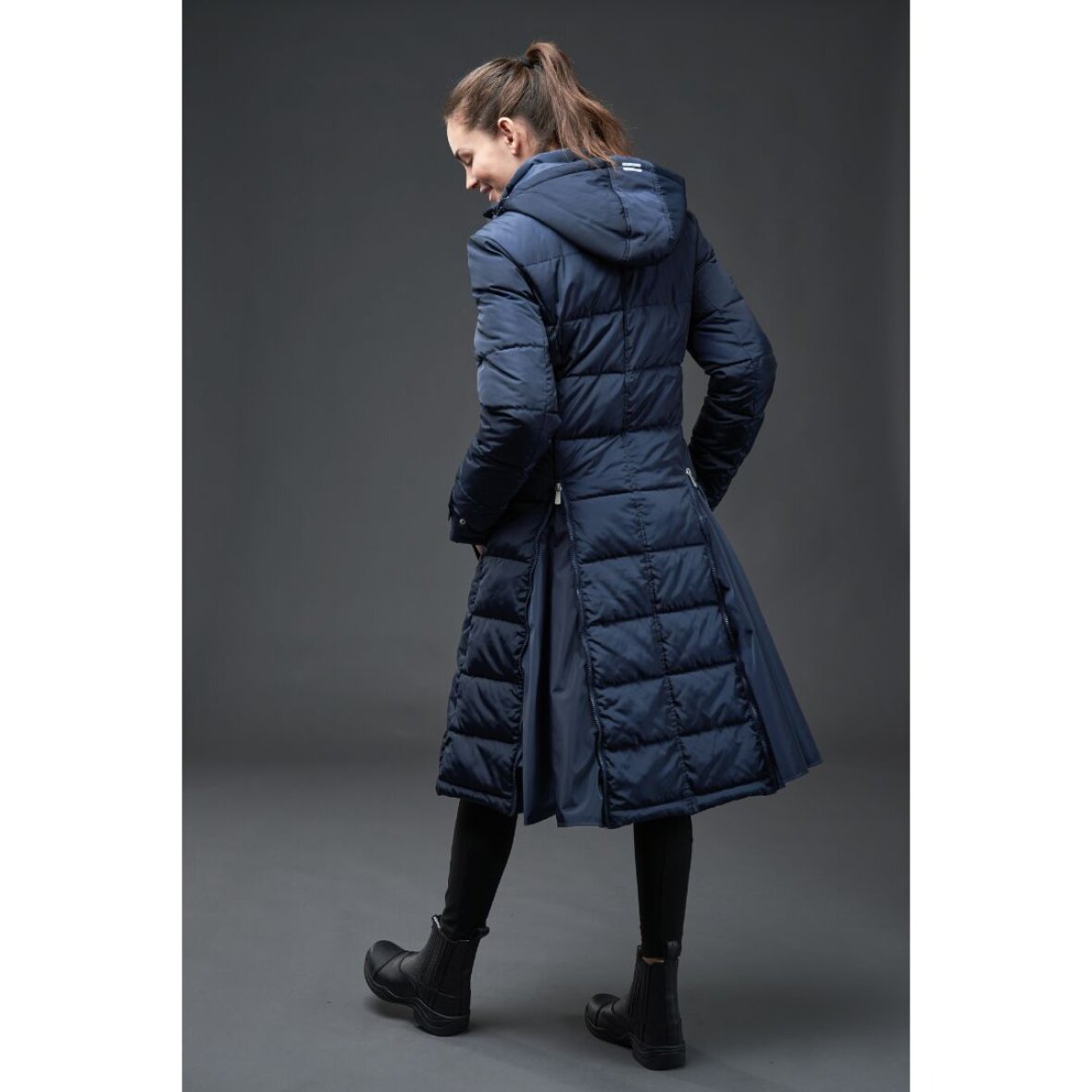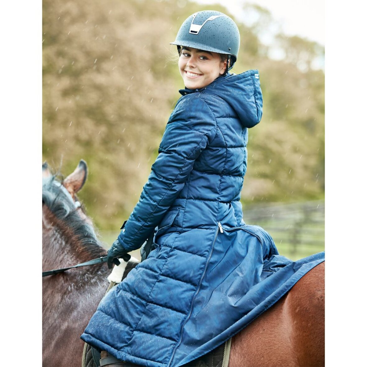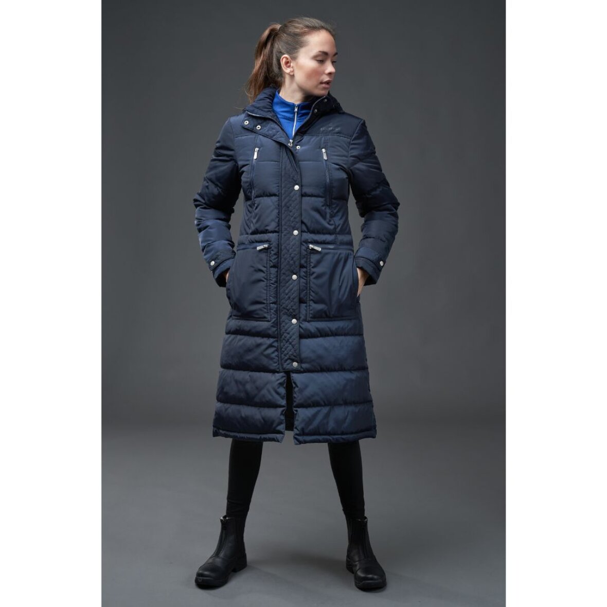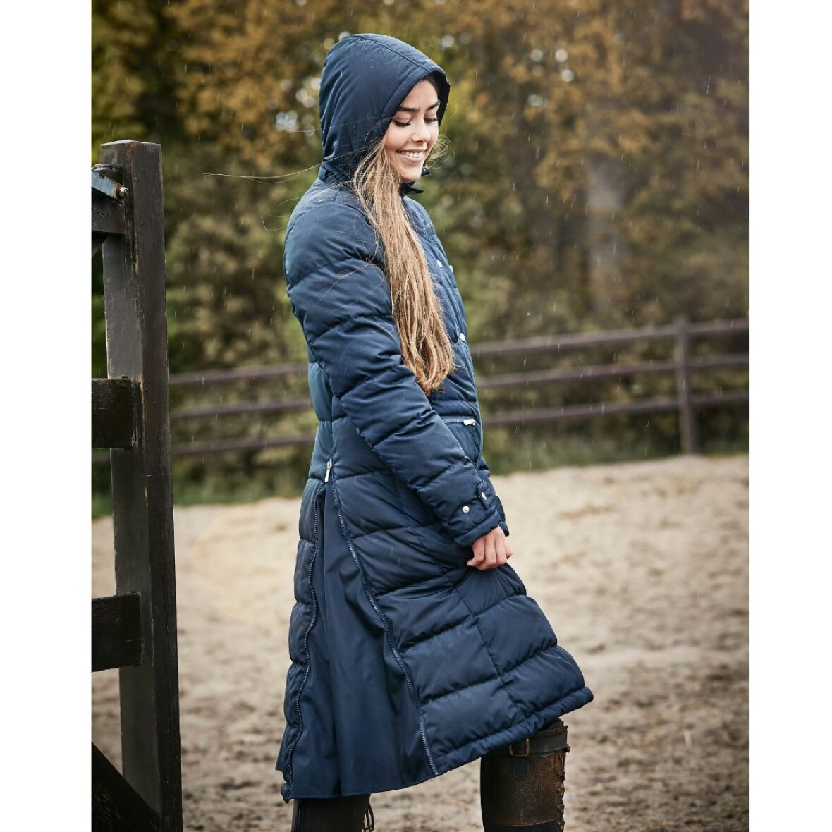 Lang vinter ridejakke fra Equipage med aftagelig hætte. Jakken er vatteret med syntetisk dun. Jakken er vandafvisende og åndbar 5000mm/3000vmp. Jakken er med lange lynlås slidser bagpå, så man nemt kan sidde i sadlen. Store lommer med teddy foring og lynlås lommer øverst. Indvendig er der elastik stropper som spændes om benene for at holde jakken på plads under ridning.