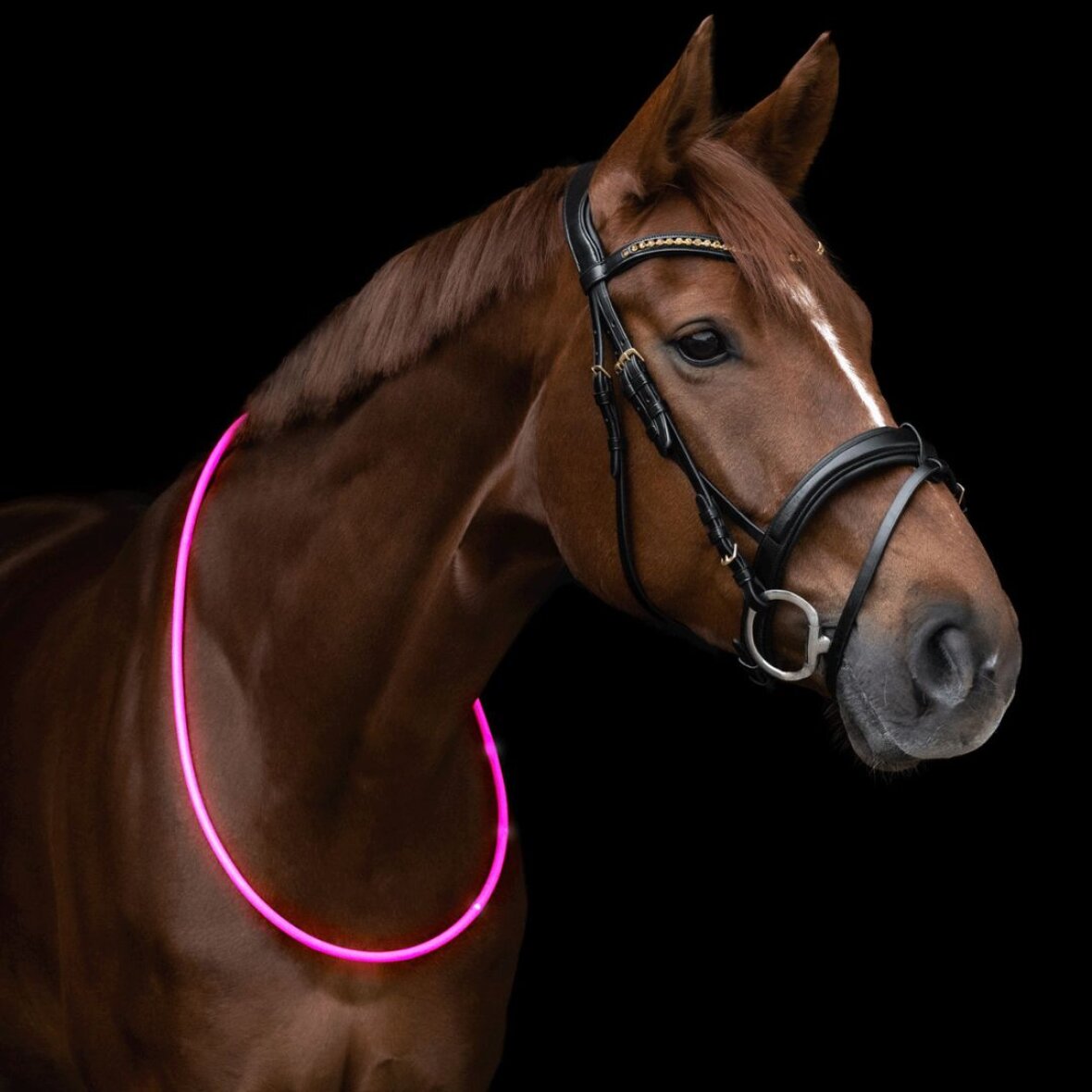 Helt genial LED halsrem til hesten fra Waldhausen. Denne halsrem kan skæres til i størrelsen, så den kommer til at passe helt perfekt. Den er med LED pære og på en opladning kan den lyse cirka 2 timer. Den har 3 lys funktioner, 2 blik og kontinuerligt lys. Denne LED halsrem kan oplades med USB-lader, sådan en medfølger i pakken. Det tager cirka 1,5 time at oplade halsremmen og så er den selvfølgelig vejrbestandig.