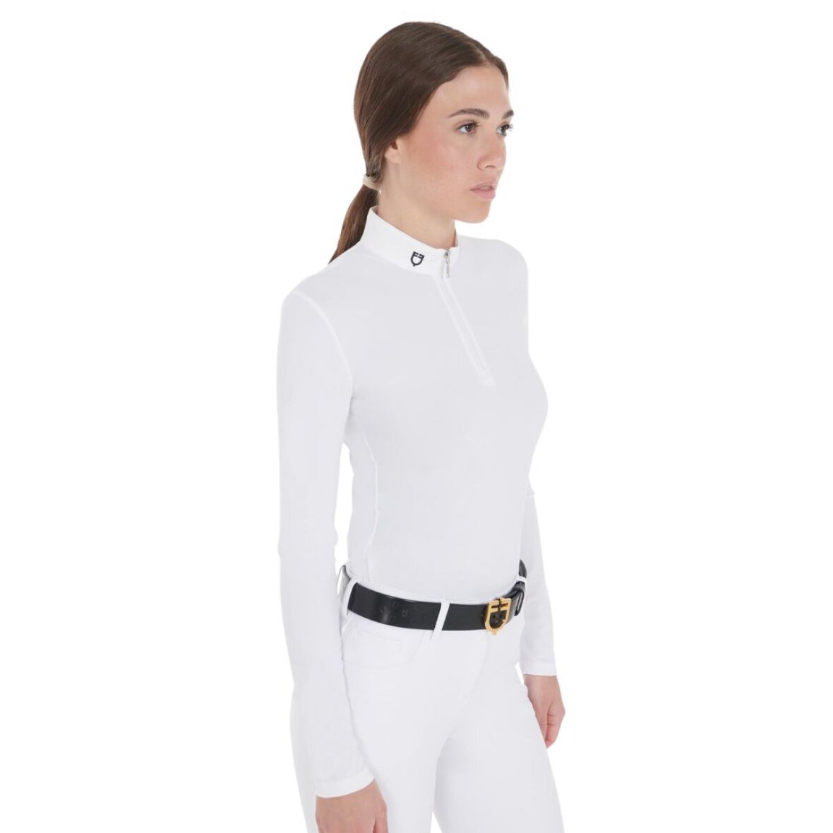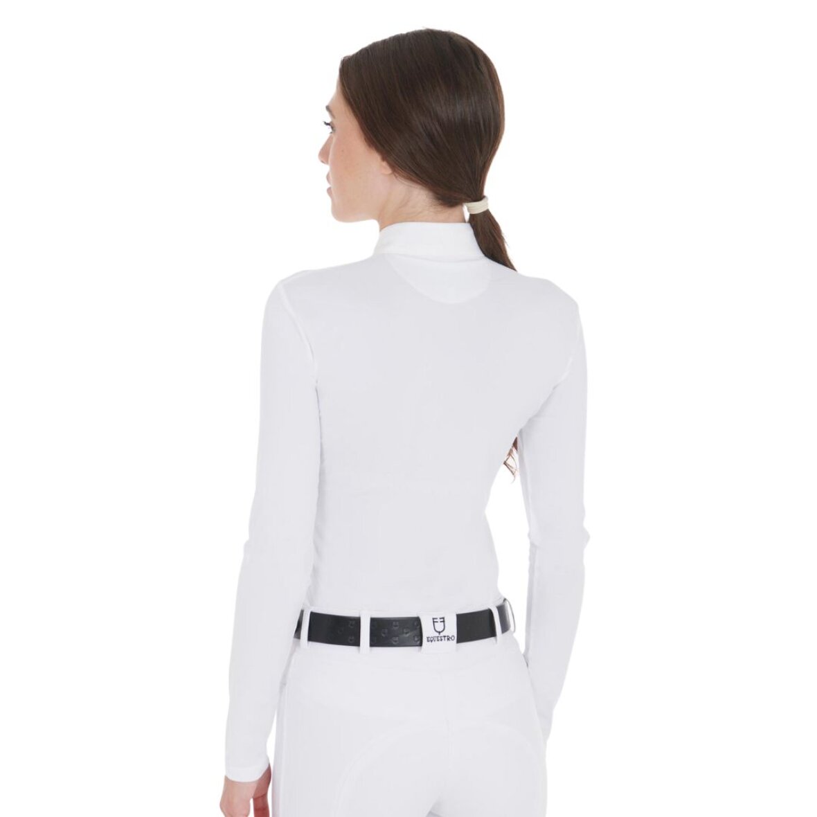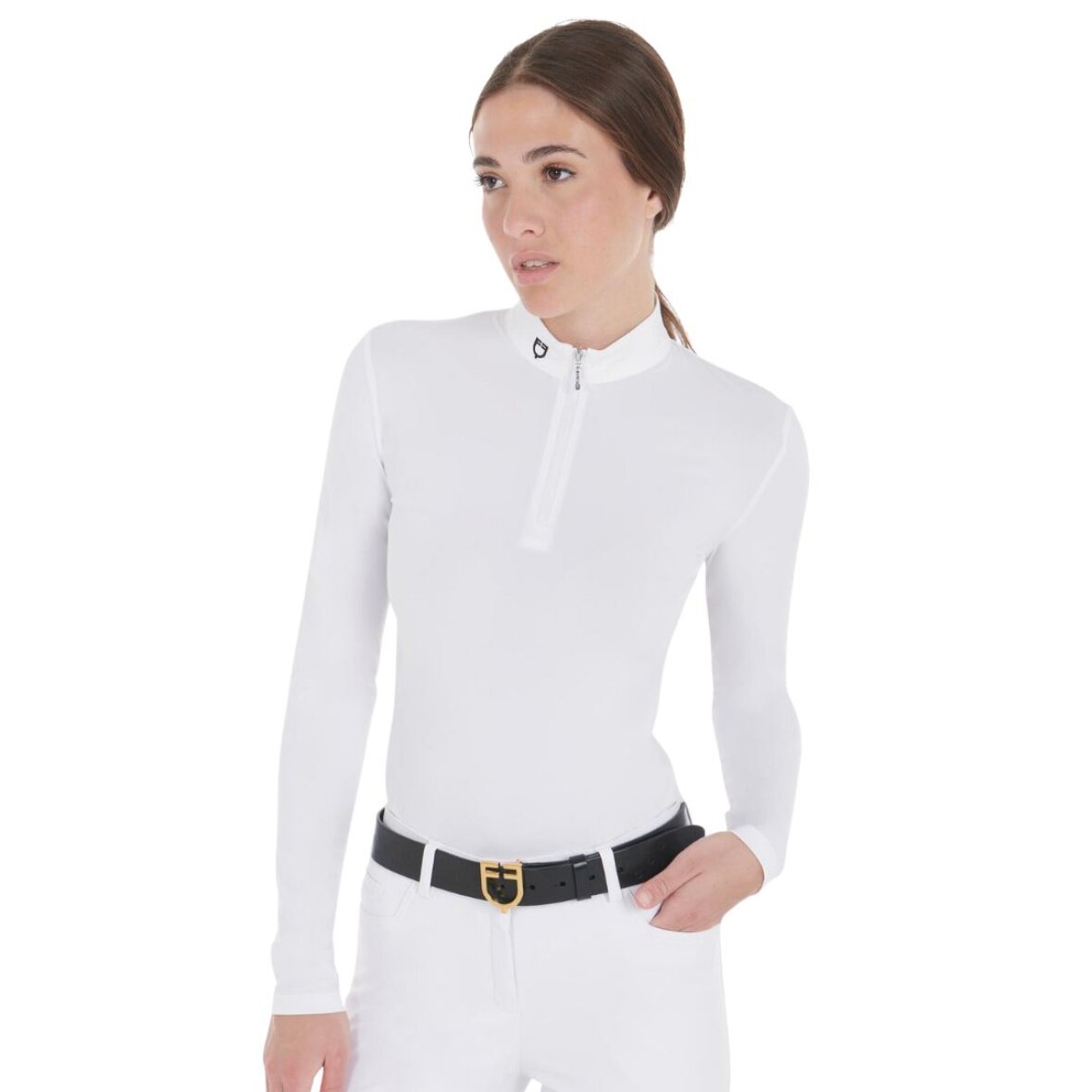 Slim fit stævnebluse fra Equestro. Blusen er fremstillet i teknisk materiale som er åndbart, hurtigtørrende, strækbar og har antibakterielle egenskaber. Den er med høj krave med broderet Equestro logo på den ene side og lukkes i fronten med kort lynlås.