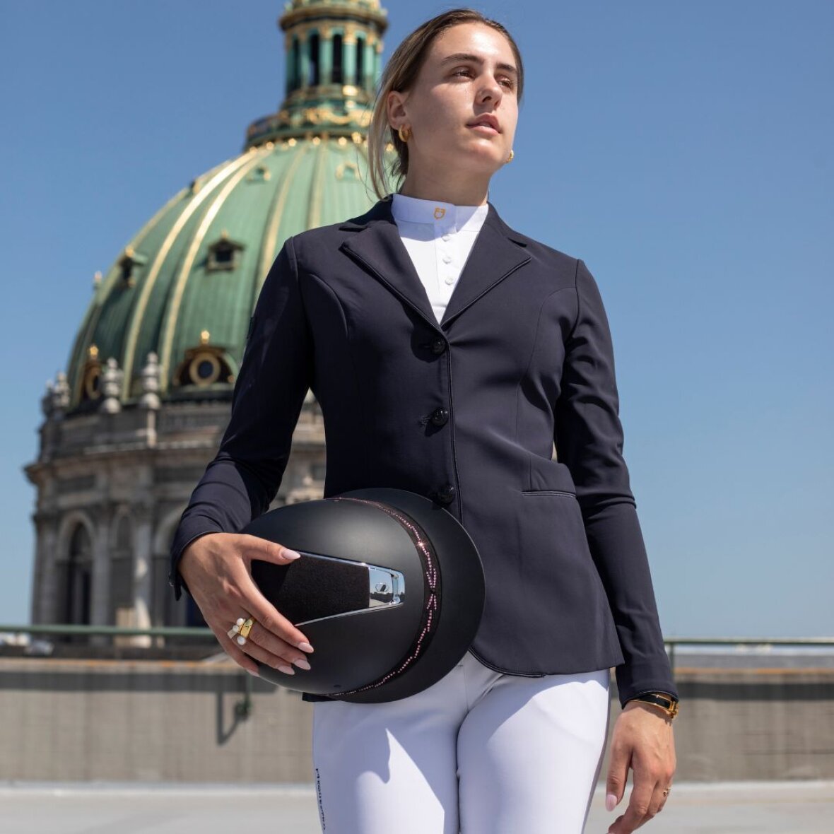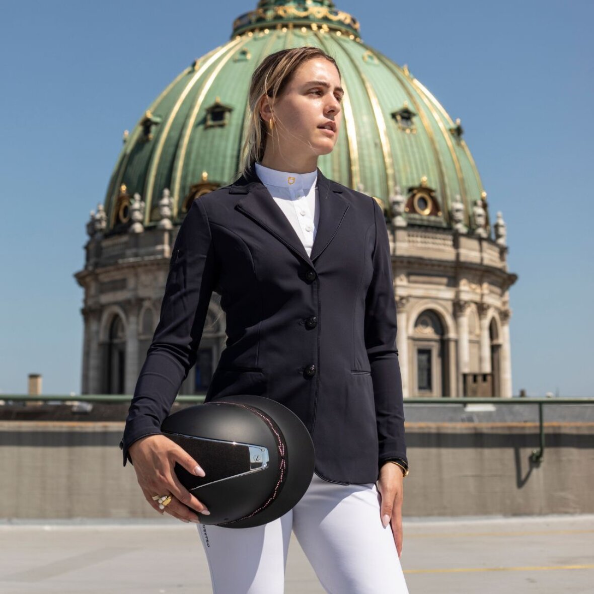 Elegant stævnejakke fra Equestro. Stævnejakken er fremstillet i teknisk materiale som gør den super åndbar, letvægt og har en god komfort som gør du har en god bevægelsesfrihed. Den lukkes i fronten med 3 knapper og har Equestro logo patch i gummi på det ene ærme. 2 kunstige kommer i fronten og 2 slidser bagpå. Equestro logo print på foret indvendig i stævnejakken.