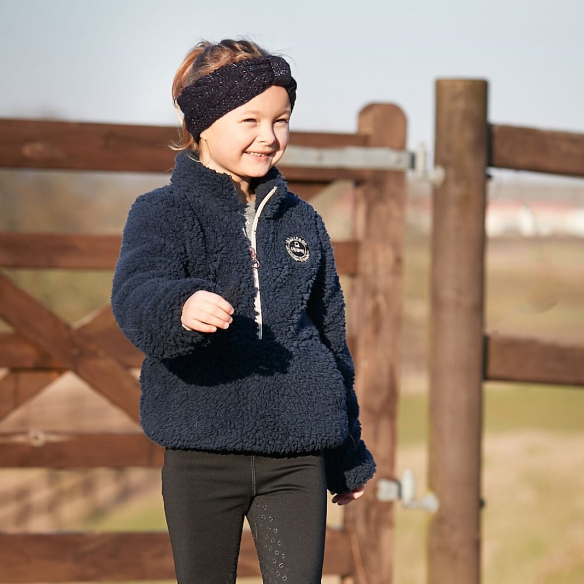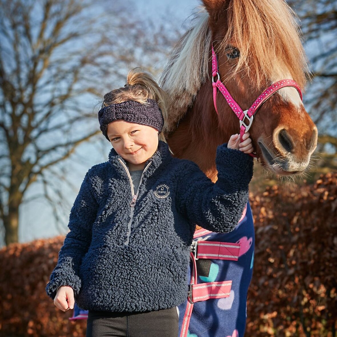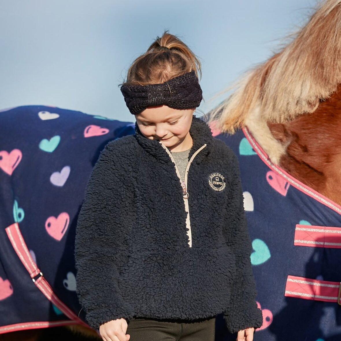 Strikket pandebånd til børn fra Equipage. Pandebåndet er formet som en sløjfe og er med forskellig farvet glimmer stykker.