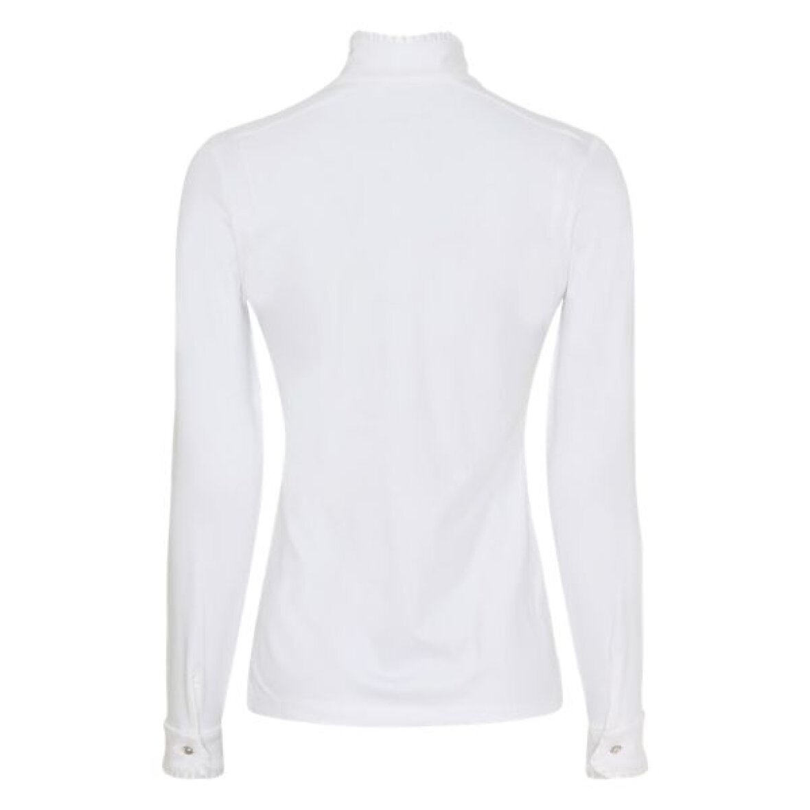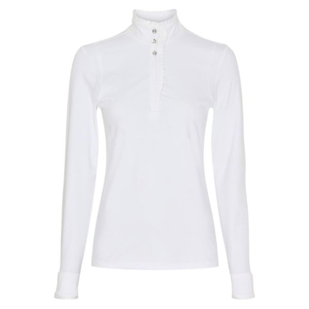 Kraftig stævneskjorte fra Equipage. Den er fremstillet i stræk- og åndbart materiale med høj krave og flæsekant. Blusen lukkes i fronten med krystal knapper øverst og trykknapper længere nede. Flæse kant i lukningen og for enden af ærmerne samt manchetter med krystal knapper.