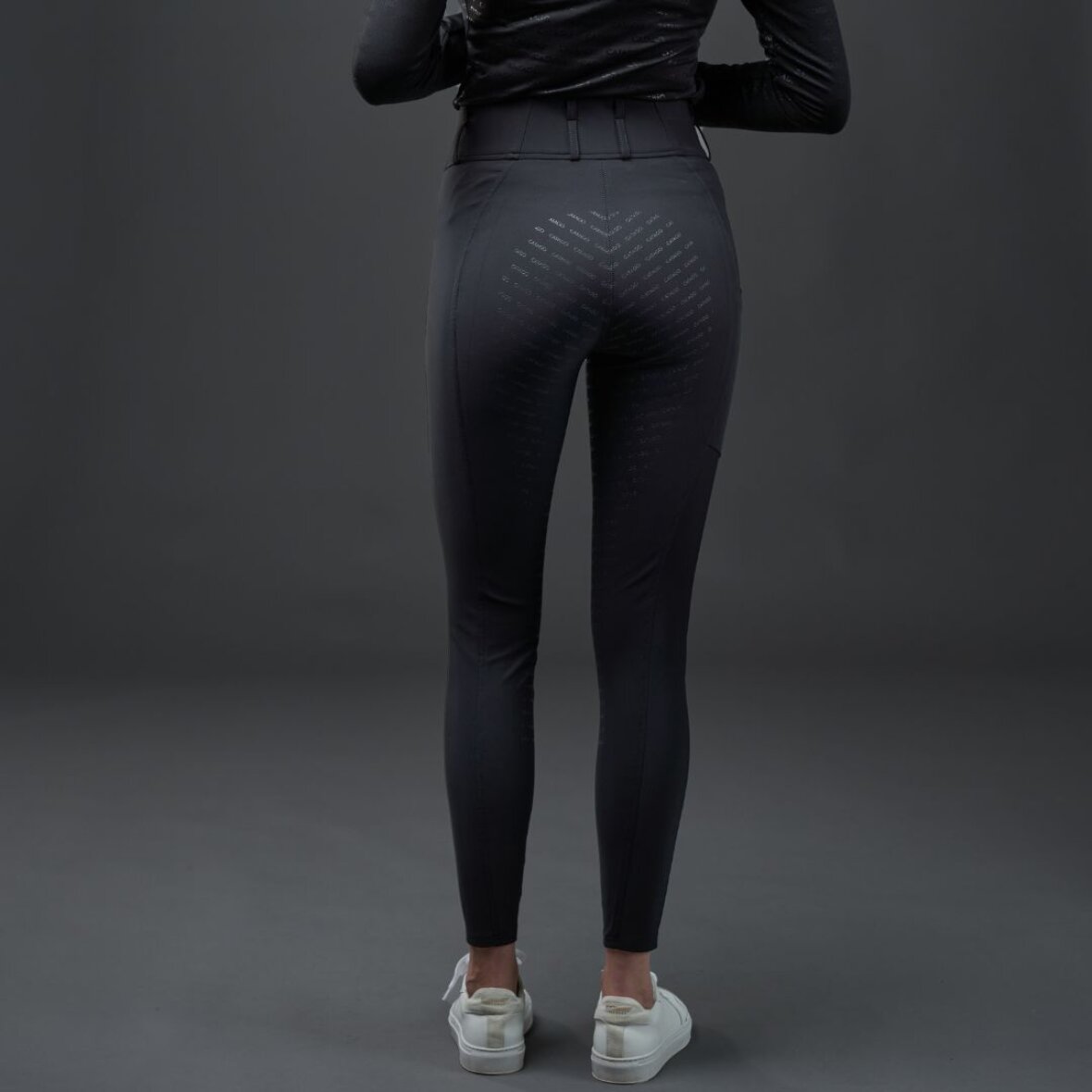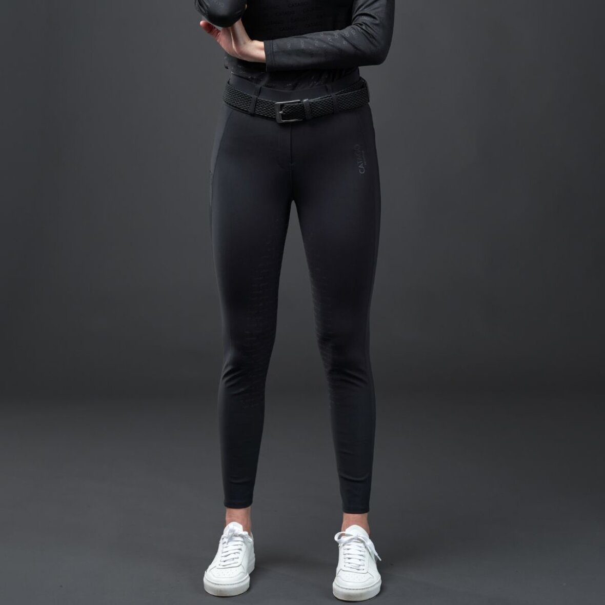 Ridetights med bæltestropper fra Catago. Disse ridetights er med fuld silikone grip i logo skrift mønster. Bred elastik linning med bæltestropper. Telefonlomme på det ene lår. Diskret Catago logo ved den ene hofte. Ridethigts'ene er remstillet i ånd- og strækbart materiale.