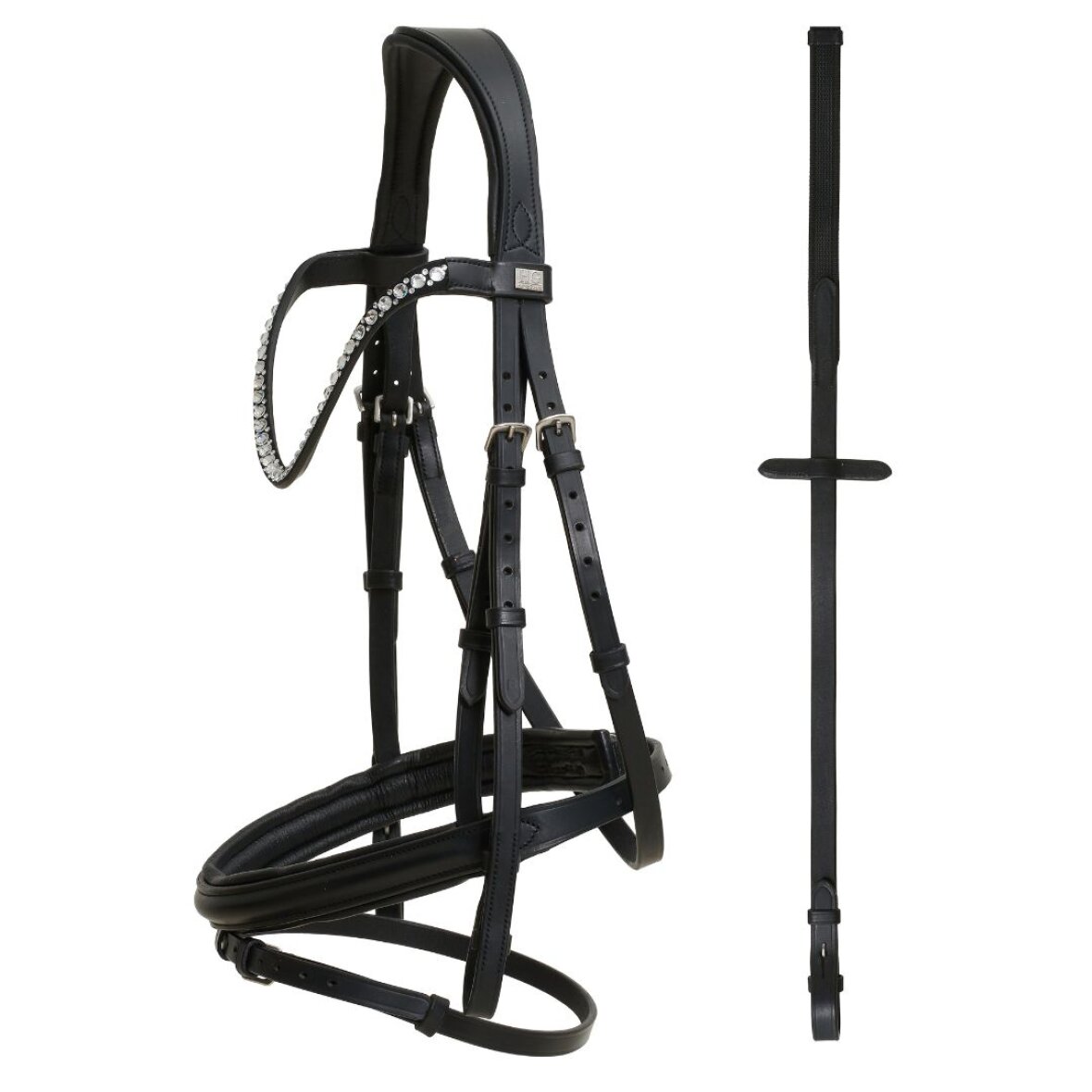 Læder trense fra Horseguard. Denne trense er med anatomisk formet nakkerem og blød foring. Smalt pandebånd med krystaller. Smalt næsebånd med blød foring. Der medfølger webtøjler til denne trense.