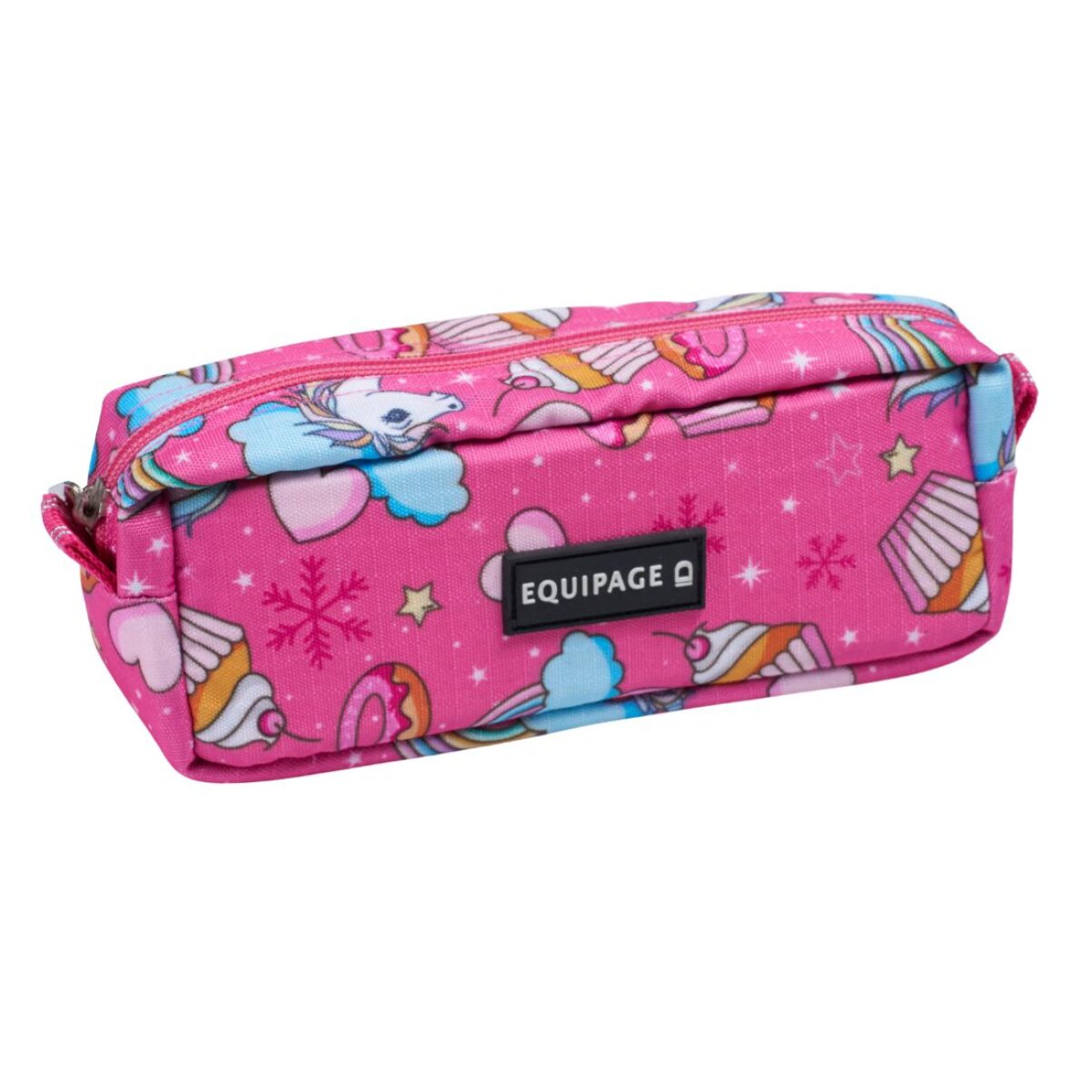 Penalhus i pink fra Equipage. Penalhuset er med unicorn, regnbue og cupcake motiv og lukkes med lynlås. Equipage logo på fronten i gummi.