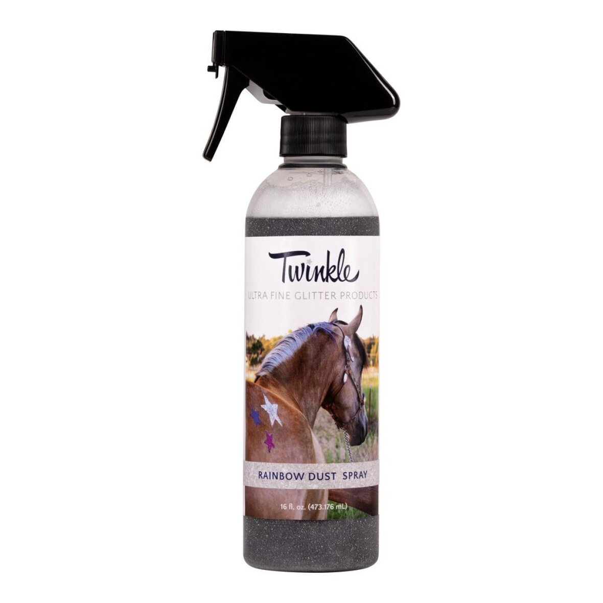 Twinkle Rainbow Dust Spray tilføjer en dejlig drys farverig fin glitter til din hest. Rainbow Dust 453g spray tilføjer din hest glans. Som med alle glitter produkter, skal du ikke sprøjte nær øjne eller hestens hoved. Kan også bruges på hunde! Sprayen kan også bruges på tøj og mennesker Test på et skjult område for at være sikker på, at der ikke er nogen uønskede ændringer.