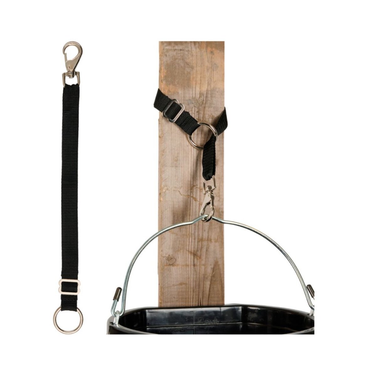 Kraftig spandholder fra HorseGuard, med stærk metalring og nem karabinhage med pistol. Anvendes til at hænge en vand-eller foderspand inde i boksen eller til at tag med til stævner. Kan også bruges til at fastgøre hønet i paddocken eller traileren. Justerbar længde, så den passer til mange forskellige formål.
