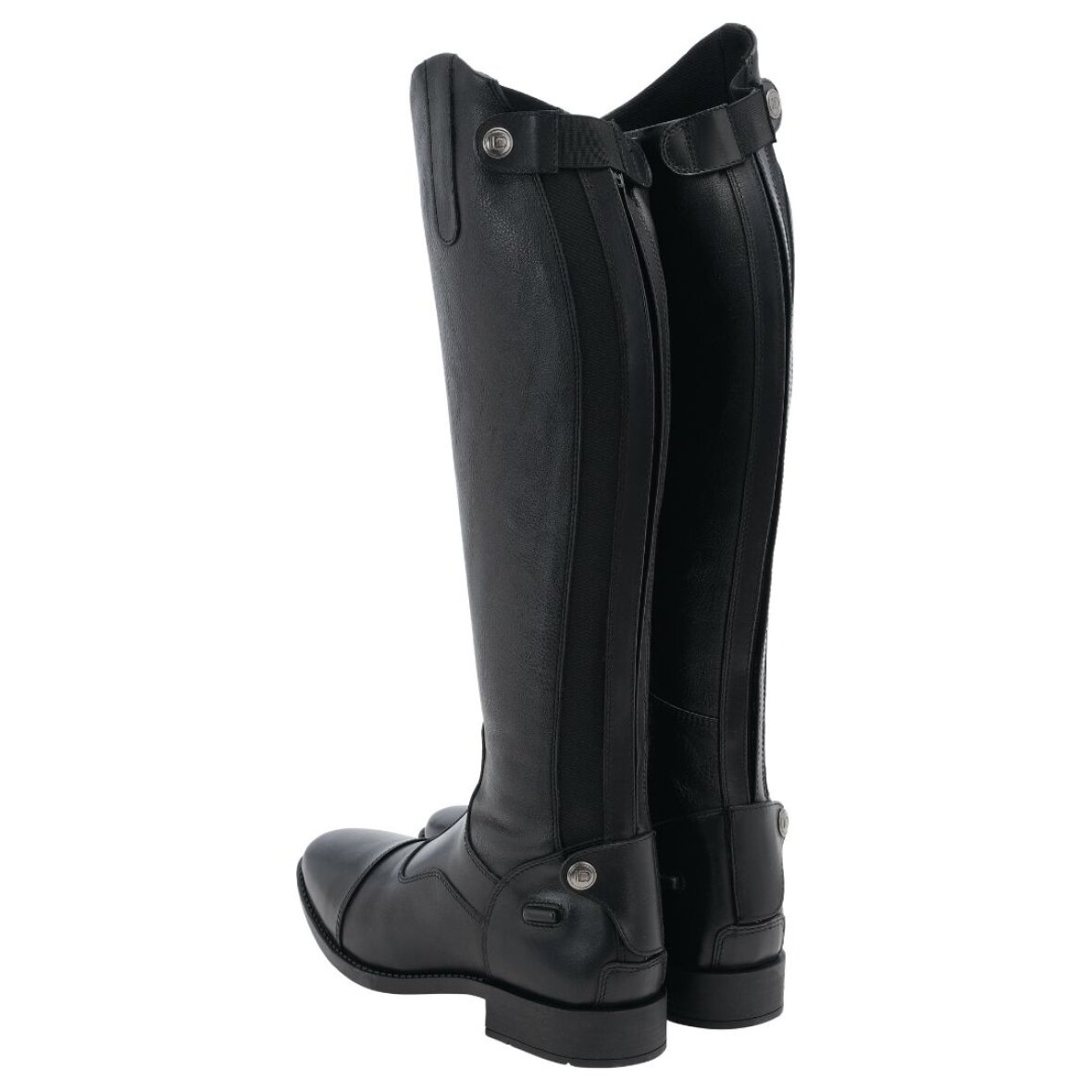 Lange ridestøvler med lynlås fra Equipage. Disse ridestøvler er fod delen fremstillet i ægte læder og skaftet af syntetisk læder. Skridsikker gummisål med hæl. God bred elastik op langs lynlås for nemmere at kunne spænde støvlen på benet. Læder stropper øverst og nederst på støvlen for at beskytte lynlåsen.