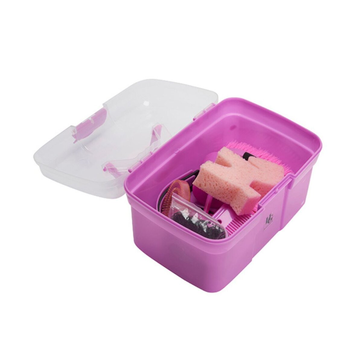 Striglekasse med indhold fra HorseGuard. Denne strigletaske er til den yngste rytter i farven pink. Indholdet består af en svedskraber, man elastikker, hovpensel, hovrenser, mankam, svamp, gnubber, stiv kropsbørste og blød kropsbørste.