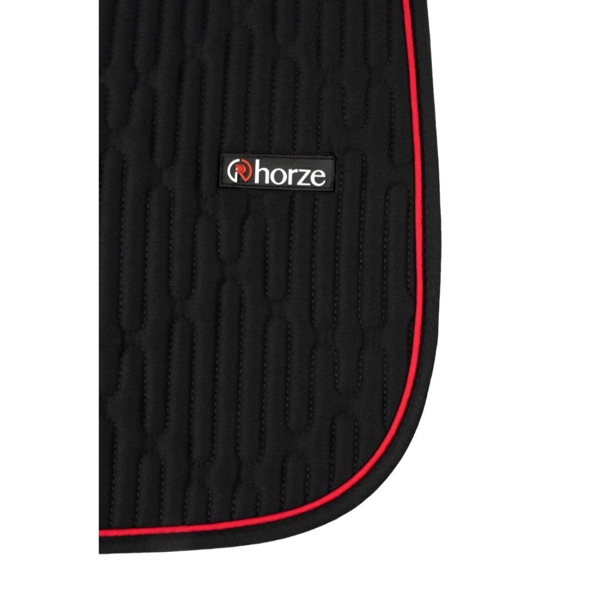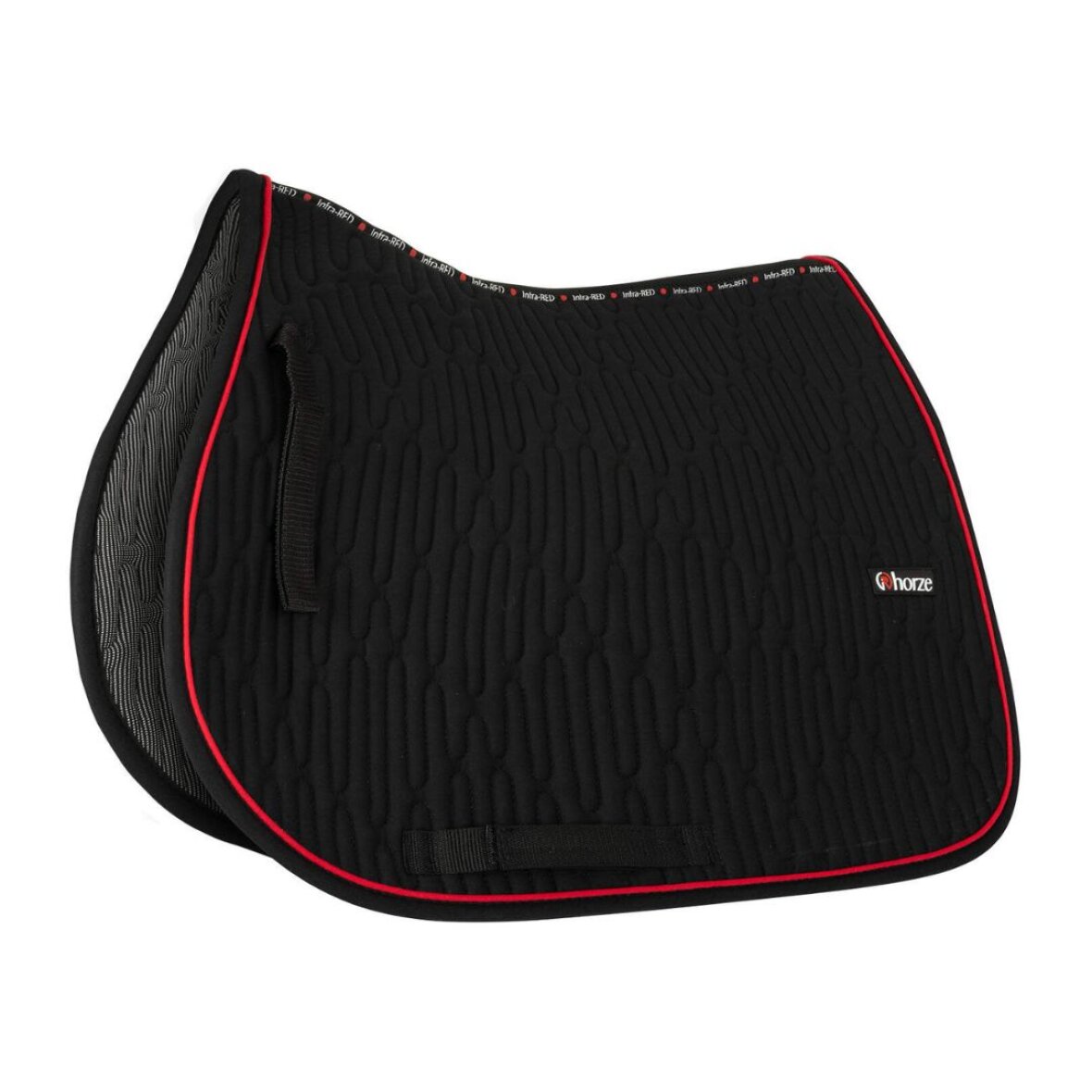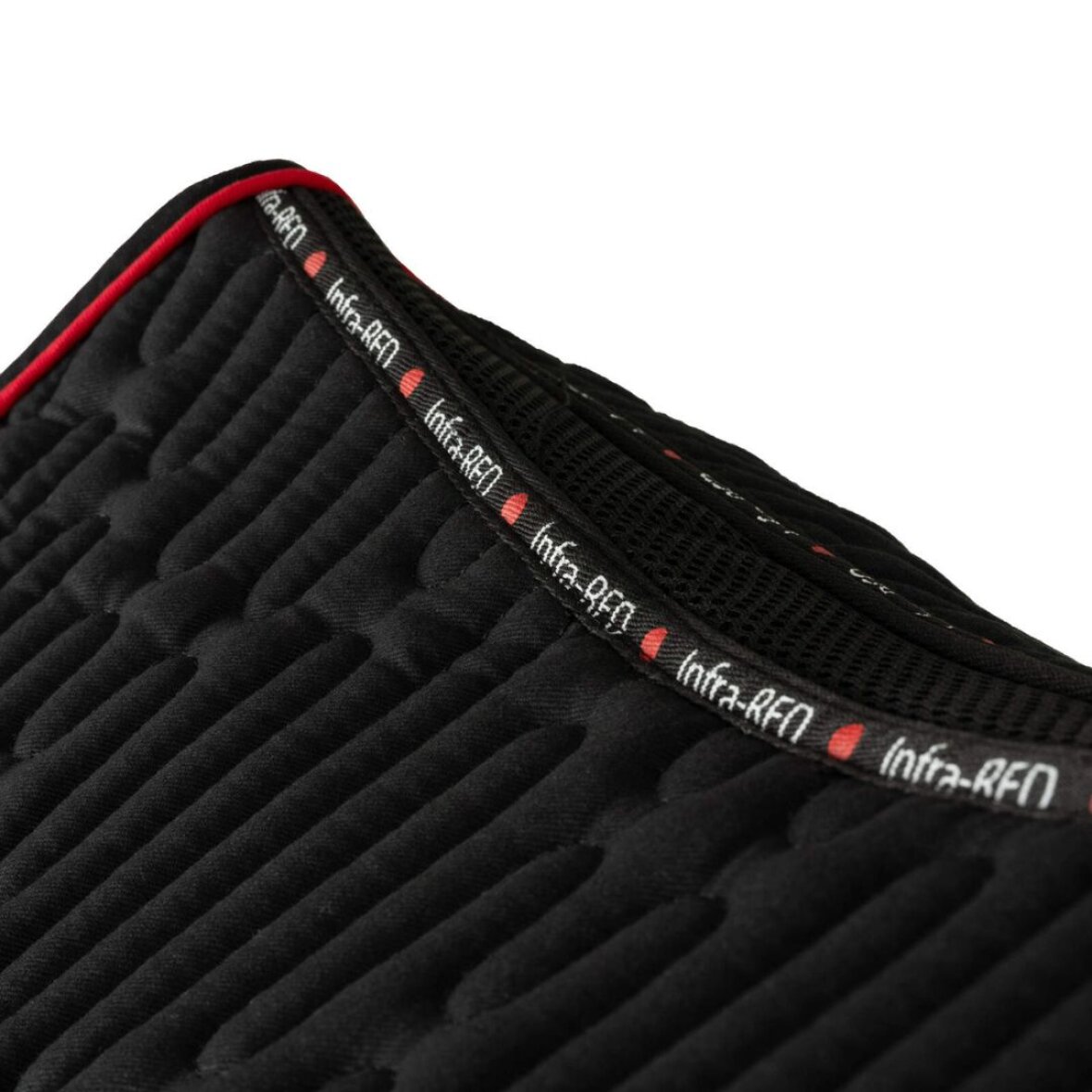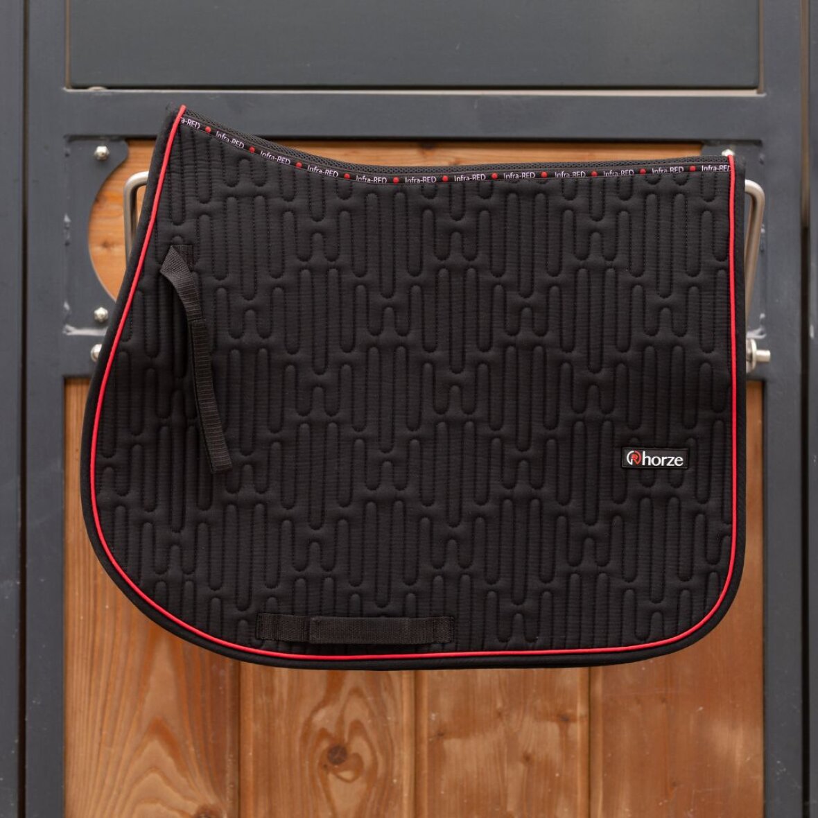 Infrarødt spring underlag fra Horze. Dette underlag er enkel og elegant med twillbomulds yderside og infrarødt tech-materiale. Keramiske nanopartikler indvævet i materialet absorberer energi fra hestens krop og frigiver infrarøde stråler på 8~12μm tilbage til hestens krop. Infrarøde stråler kan penetrere væv og udlede vandholdige molekyler, hvilket kan føre varmefrigivelse, så blodkar udvides og giver øget blodcirkulation & stofskifte, så muskler bliver smidige.