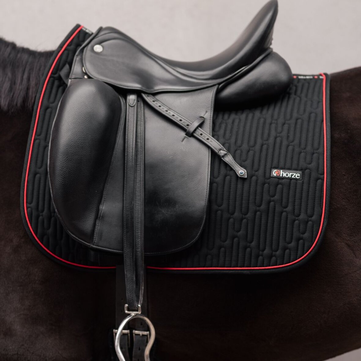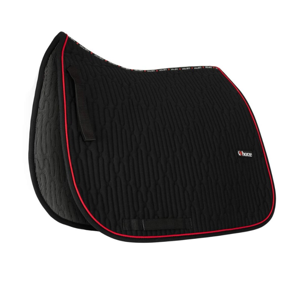 Infrarødt dressur underlag fra Horze. Dette underlag er enkel og elegant med twillbomulds yderside og infrarødt tech-materiale. Keramiske nanopartikler indvævet i materialet absorberer energi fra hestens krop og frigiver infrarøde stråler på 8~12μm tilbage til hestens krop. Infrarøde stråler kan penetrere væv og udlede vandholdige molekyler, hvilket kan føre varmefrigivelse, så blodkar udvides og giver øget blodcirkulation & stofskifte, så muskler bliver smidige.