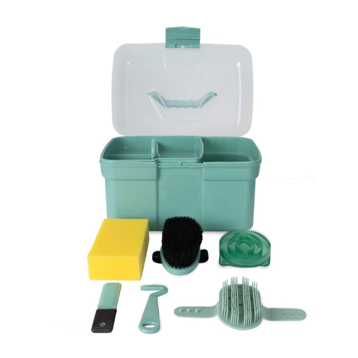 Striglekasse med indhold fra Horze. Den robuste plastikboks har en udtagelig indvendig bakke som er god til opbevaring af mindre ting og har et stort rum til godbidder. Børsterne har en særlig plads og bliver ikke blandet med det øvrige. En stor lukning udvendig sikrer boksen med et håndtag, så den er let at medbringe. Indeholder: Gummignubber, hovrenser, svamp, mankam, kropsbørste, plastik strigle.