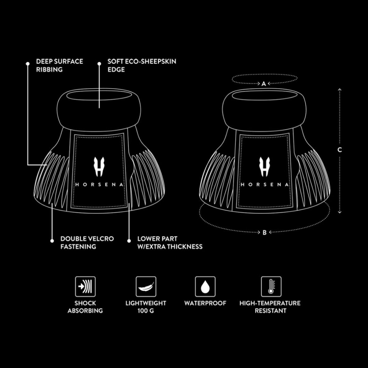 Pro-Light klokker fra Horsena er ekstrem lette og vejer kun 100 g. Det dybe rib mønster på ydersiden modstår slag og har en meget høj stødabsorbering. Den nederste del at klokken har et ekstra lag for at beskytte hovene. De er med en lille kant af øko lammeskind for at give komfort. Klokkerne lukkes med dobbelt velcrolukning med gummi logo. Klokkerne er vandtætte og modstandsdygtige overfor høje temperaturudsving.